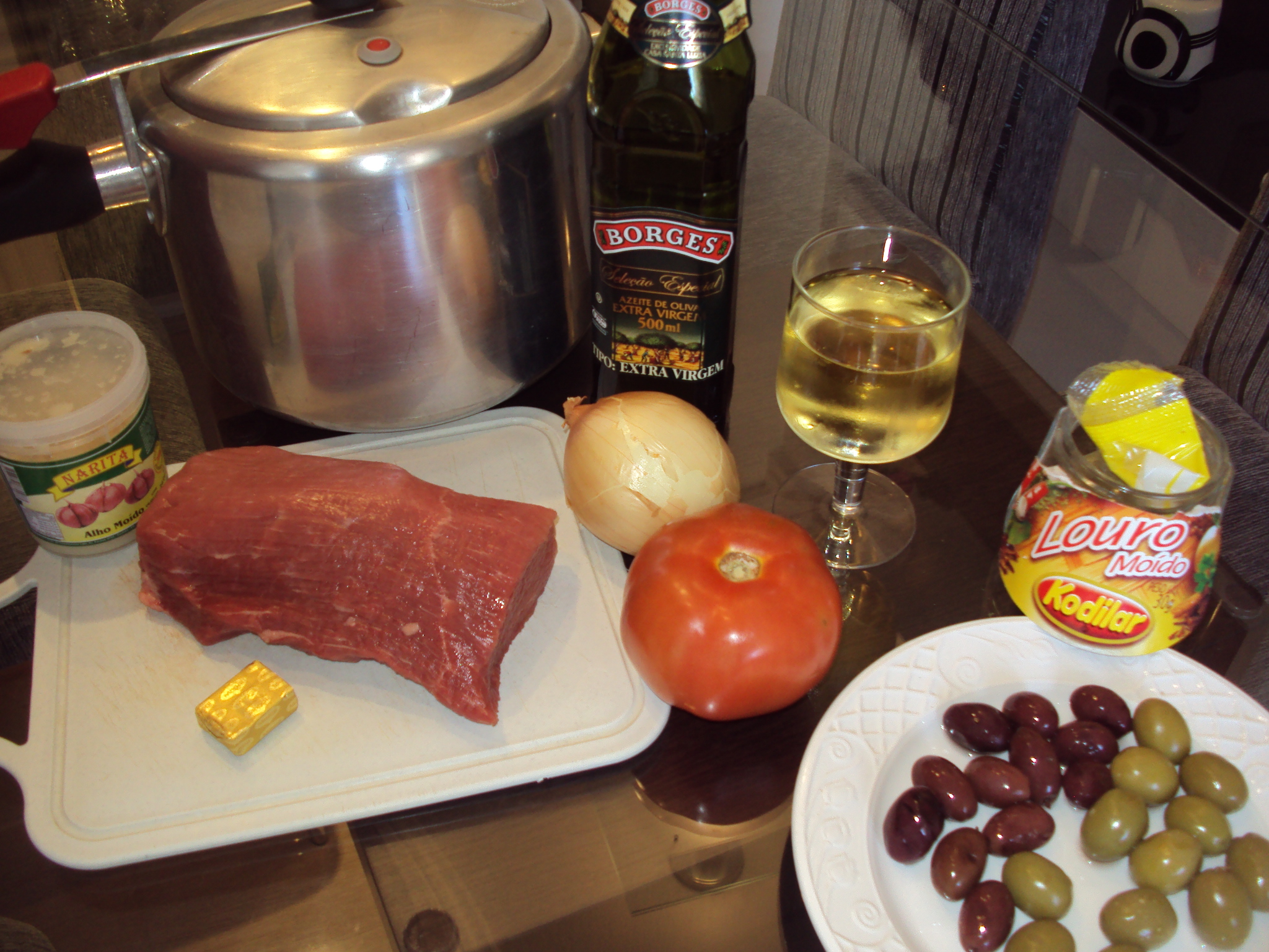 Cozinhe a posta com o sal, pimenta, louro e o vinho e uma quantidade de água (que cubra a carne) por mais ou menos 1 hora (dependendo do tamanho da posta).