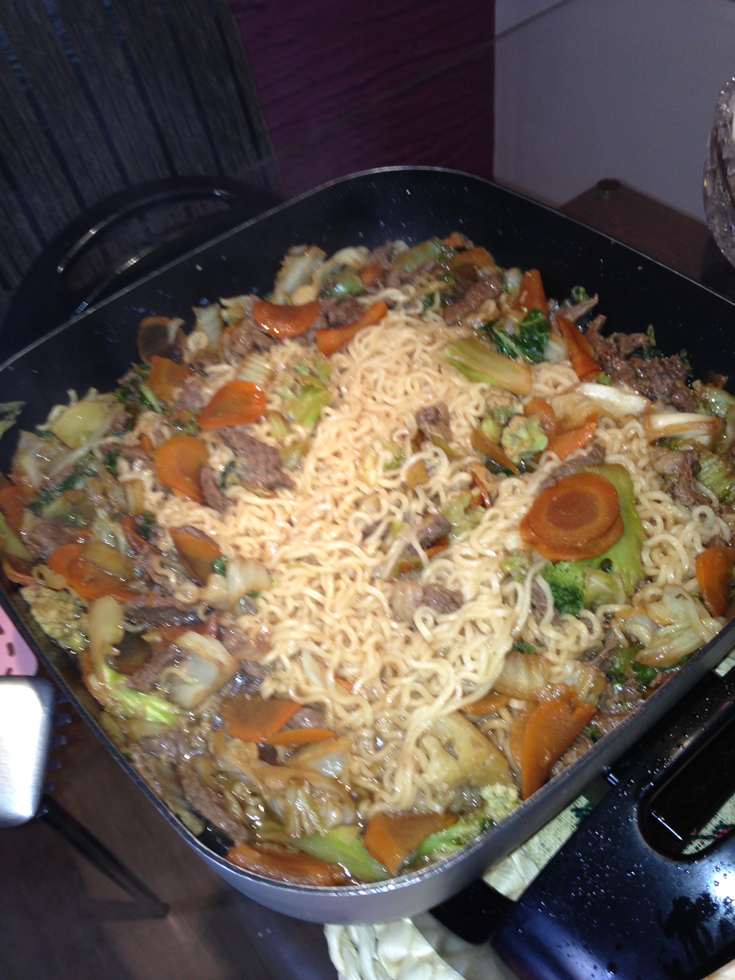 E, como não poderia deixar de ser, fui para a cozinha:  no sábado fiz um Carreteiro para 4 casais amigos deles; no domingo à tardinha, uns Bolinhos de Chuva para a Pati matar a vontade do Cesinha (meu neto que nasce em julho) e na segunda feira, ontem, um Yakisoba que é a receita de hoje.