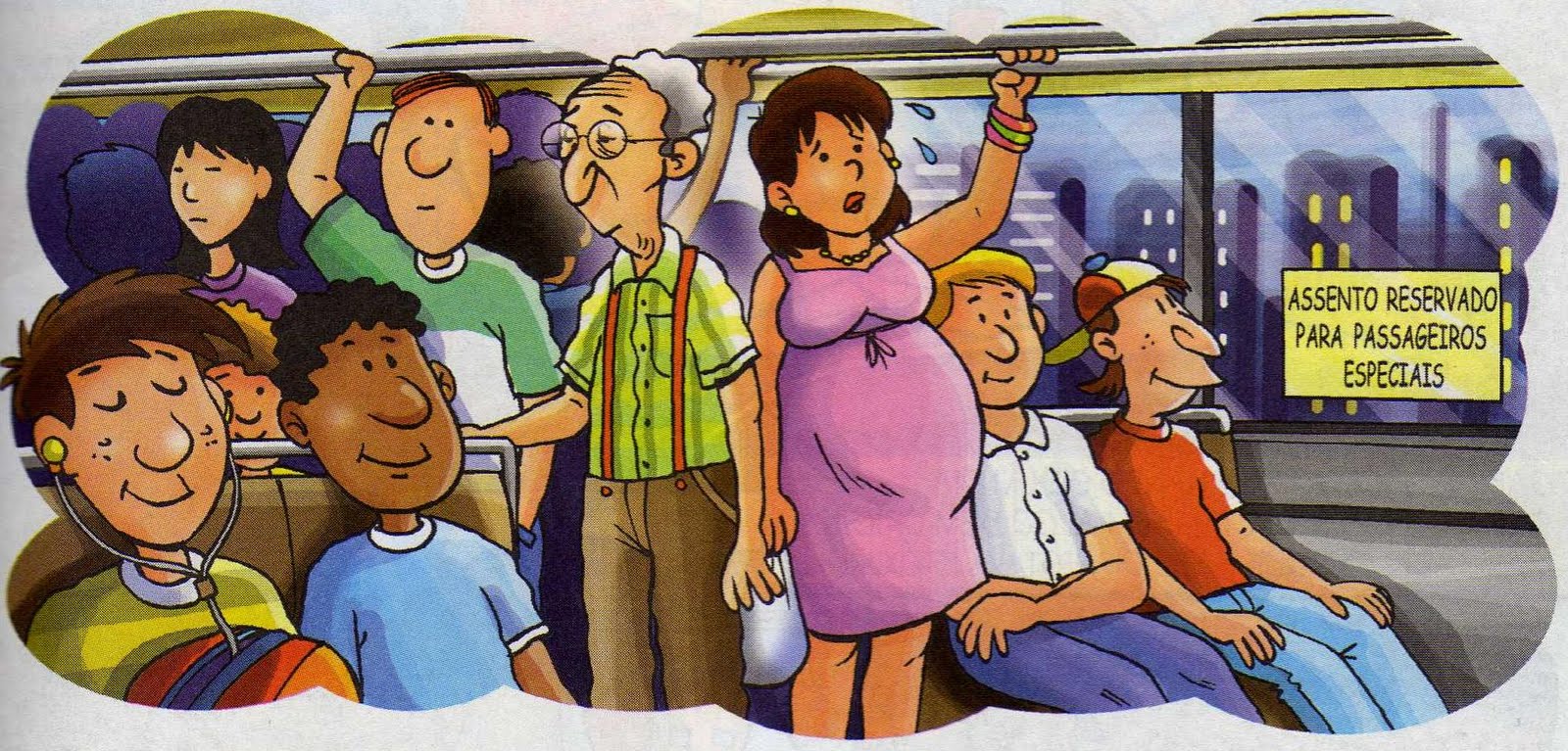 – Eu entrei no ônibus (disse ela) com sacolas e pacotes depois de ter andado muito, e todos os lugares estavam ocupados, inclusive aqueles com os dizeres de preferenciais.