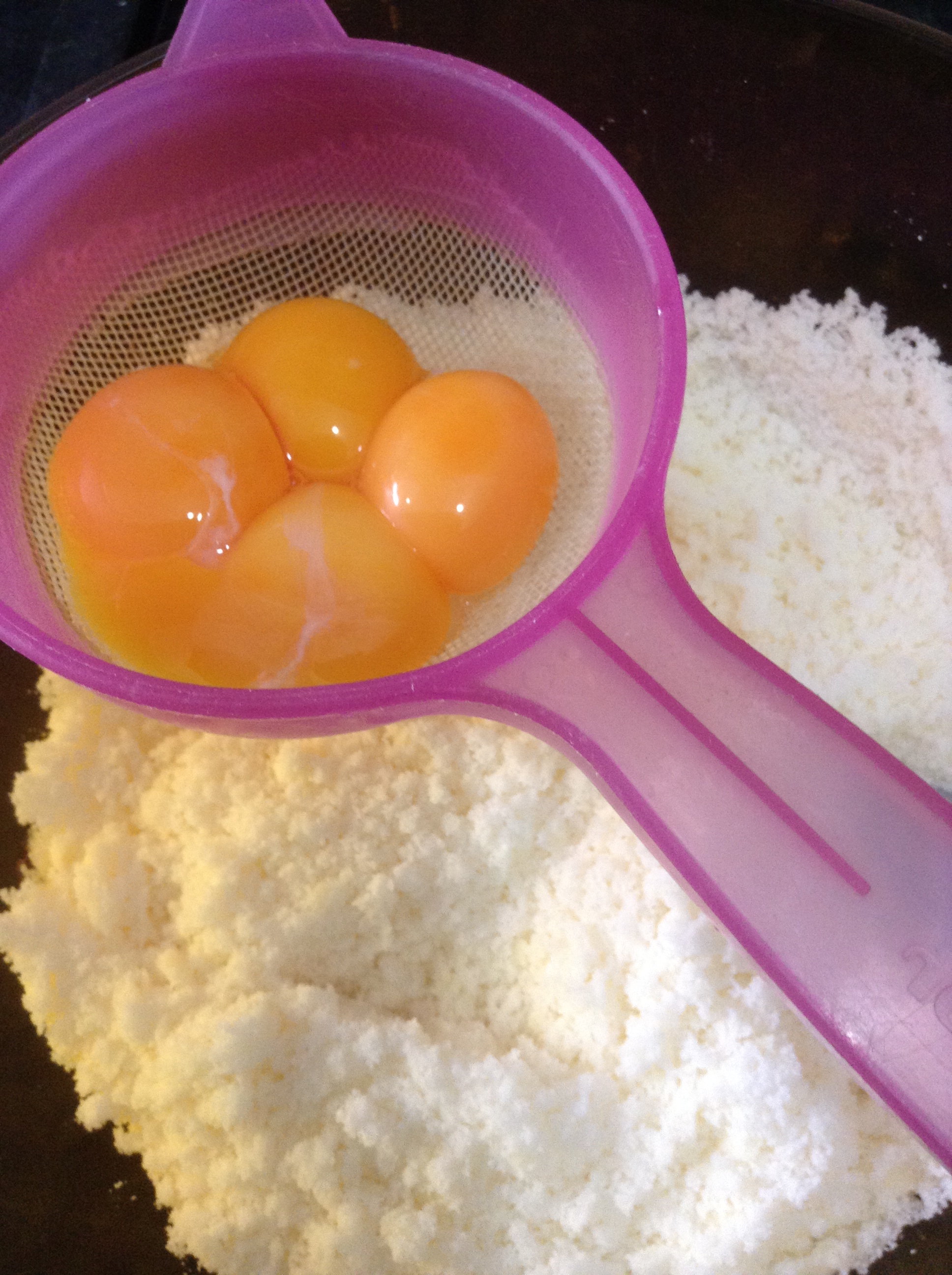 Misture o açúcar com a manteiga (eu usei doriana) e vá colocando as gemas tendo o cuidado de passá-las por uma peneira, bem como os ovos inteiros.
