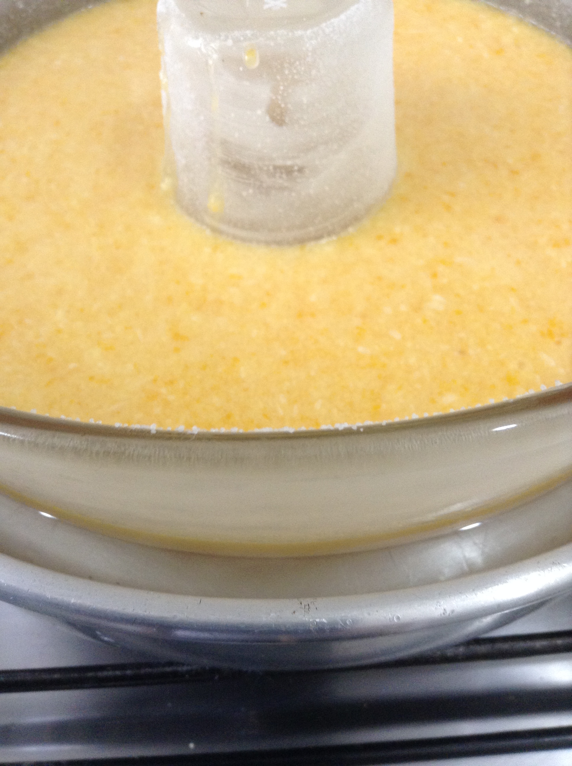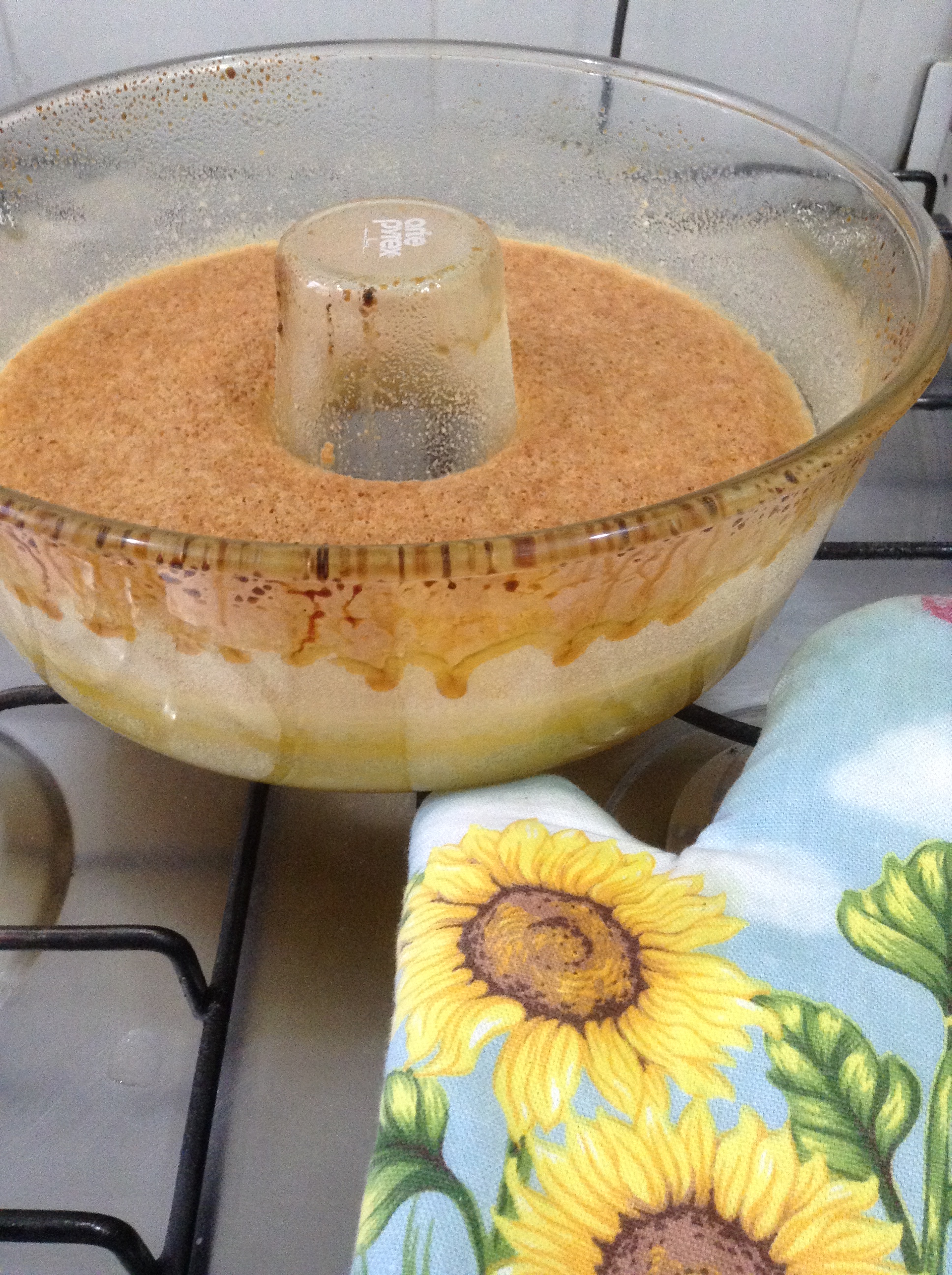 Primeira coisa: unte bem uma forma de buraco com manteiga e polvilhe açúcar nela toda. Reserve.