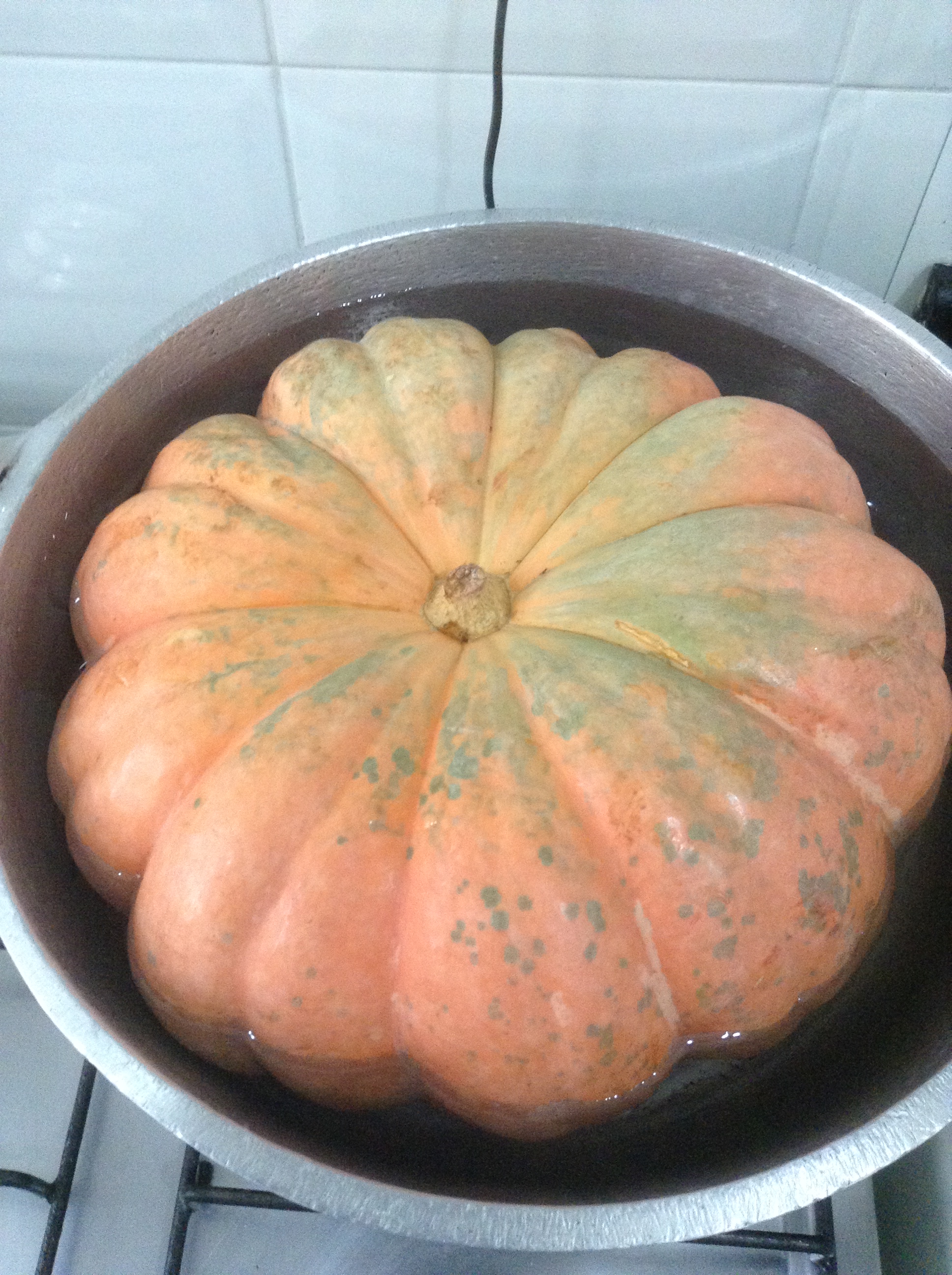 A primeira coisa a fazer é colocar a moranga em uma panela grande com água e deixar ferver por mais ou menos uma hora, tendo o cuidado de virá-la na metade do tempo.