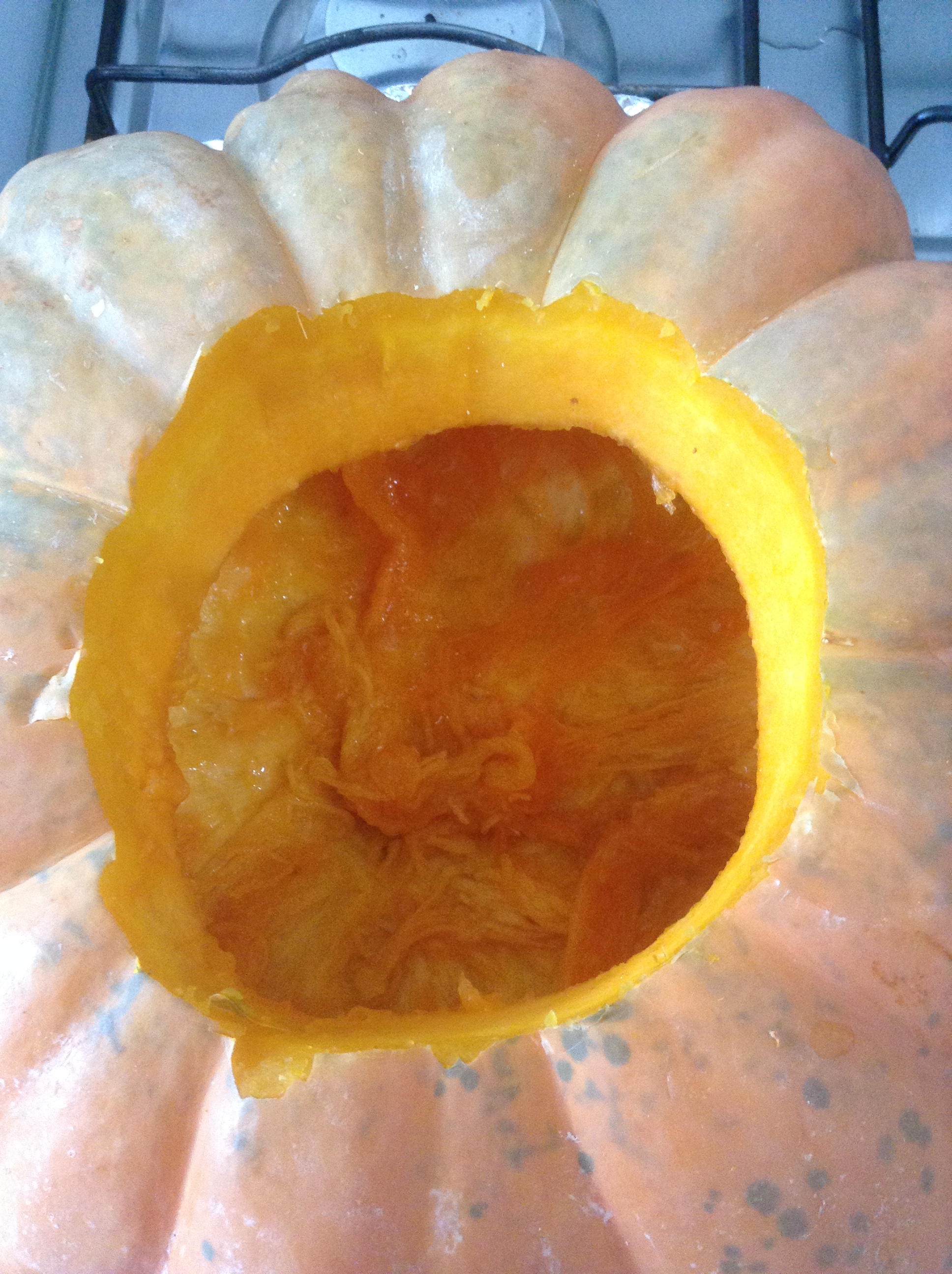 Feito isso faça uma pasta com sal, pimenta e óleo e esfregue por dentro da moranga.