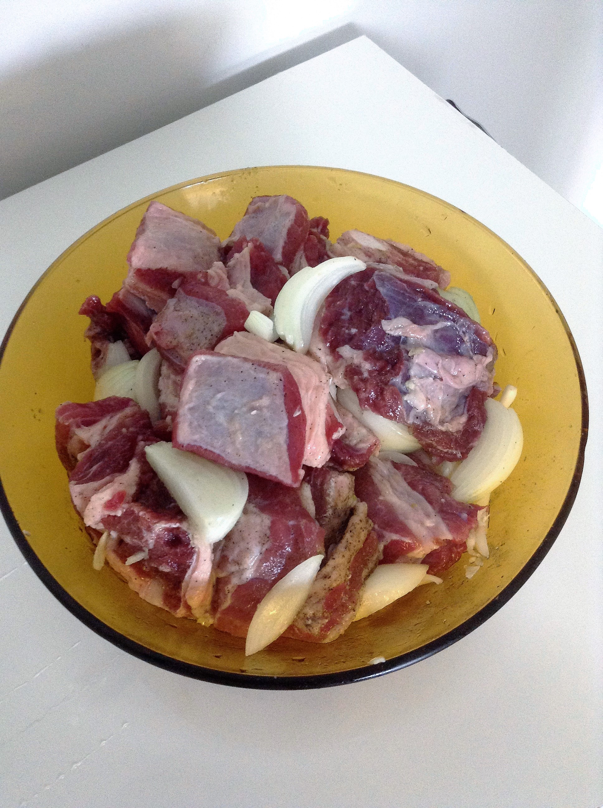Enquanto isso, tempere a carne com sal, pimenta do reino, alho e cebola.