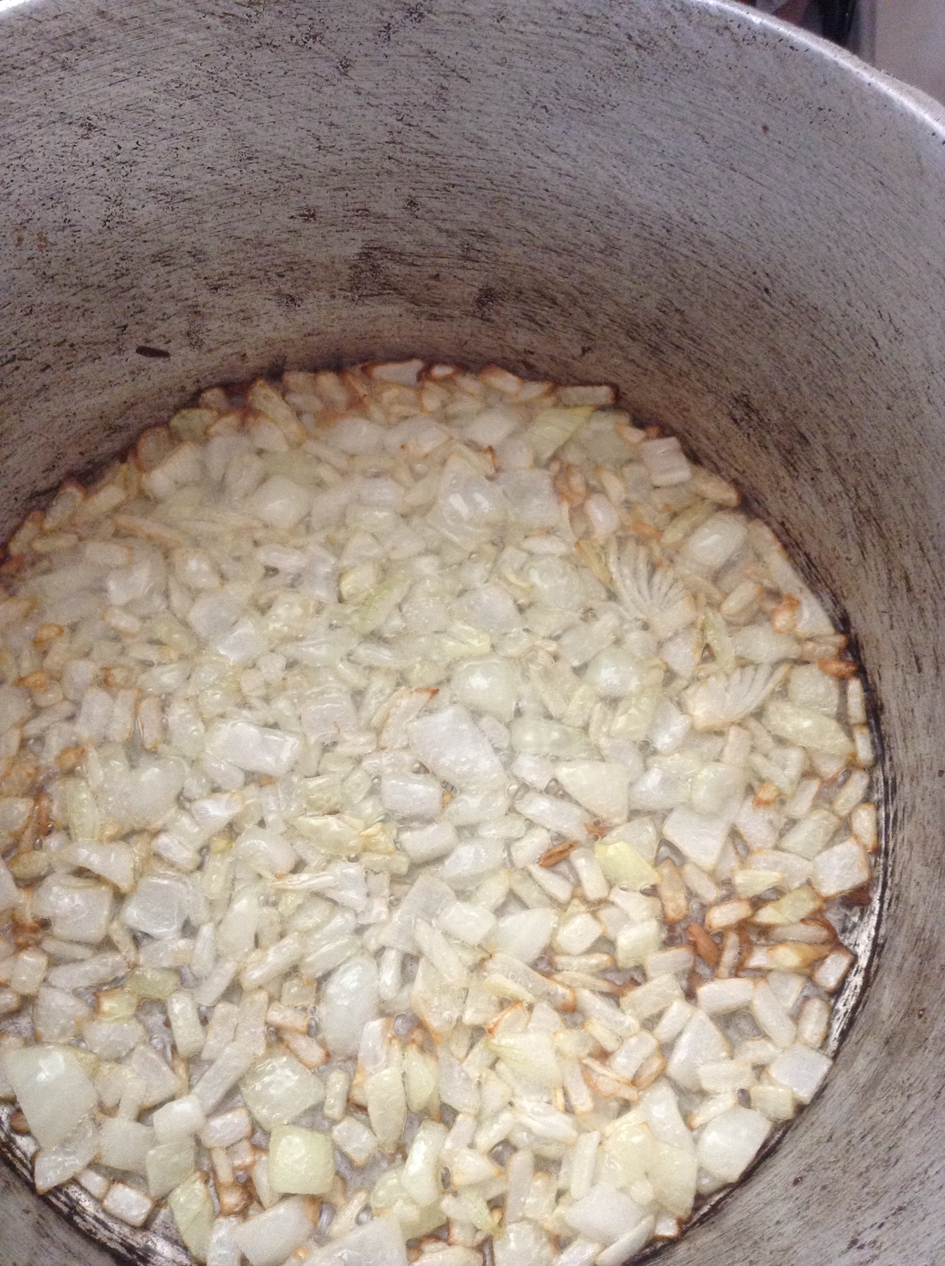 Primeira coisa a fazer é cortar alho e cebola em pedacinhos e fritar em óleo muuuuito bem, até ficar quase escura!