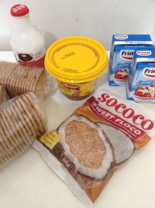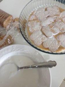 Passe o biscoito pelo leite de coco e em um pirex vai alternando as camadas com eles e o creme, deixando o creme por cima.