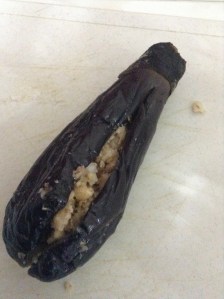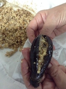 Pegue a berinjela e corte ao meio no sentido de comprimento (sem separar as partes) e vá recheando com a mistura de nozes e alho.