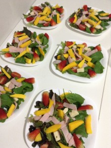 Rúcula, alface roxa, tomate cereja, queijo coalho, peito de peru, manga, morango e gergelim.