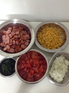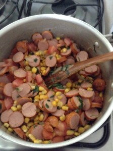 Frite a cebola em um pouquinho de óleo, junte o milho, tempere com pimenta do reino e sal, junte a salsicha e o cheiro verde. Reserve.