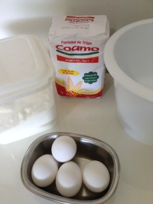 Em uma vasilha junte os ovos (inteiros), açúcar e trigo.