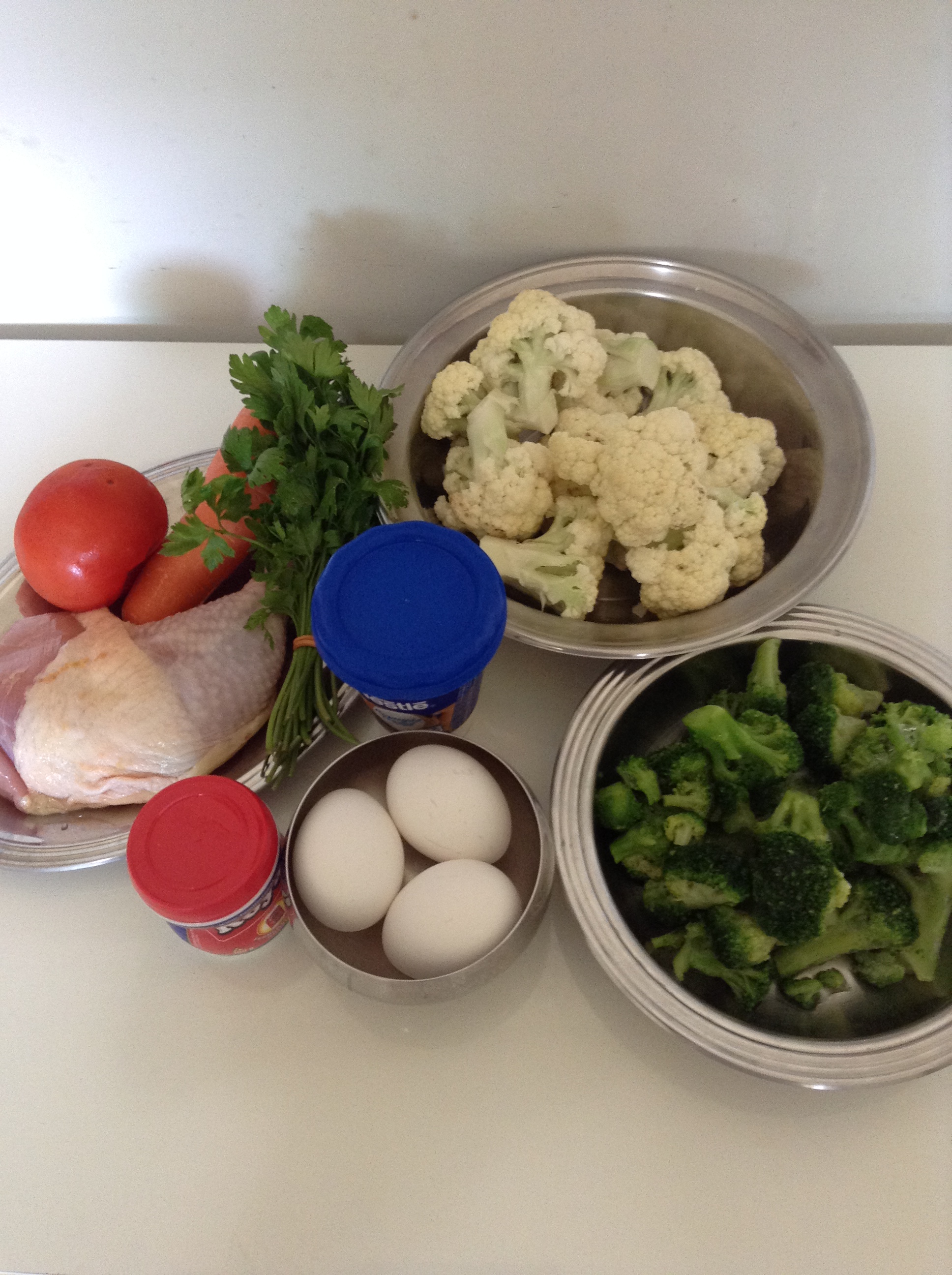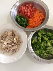 Cozinhe o frango e desfie; pique o brócolis; rale a cenoura no lado grosso do ralador; corte o tomate em pedacinhos; pique o cheiro verde.
