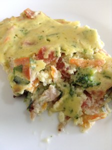 Misture tudo ao creme de couve flor, tempere com sal e pimenta do reino e junte o fermento.