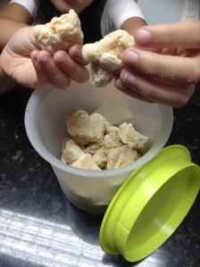Deixe esfriar e corte em pedacinhos, passando no leite em pó.