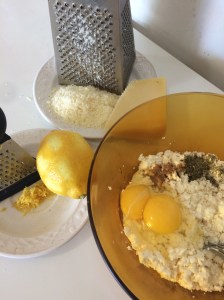 Junte os ovos, o tomilho, a noz moscada, as raspas do limão, o sal e o queijo ralado.