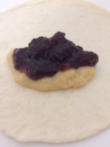 Coloque a massa folhada aberta sobre uma tábua e dentro um pouco desse creme mais uma colher da geleia.