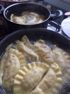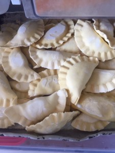 Tem que colocar uma colherada em cada massa e fechar como pastel.