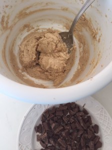 Adicione os ingredientes secos, misture com uma colher e junte o chocolate até ele se incorporar à massa.