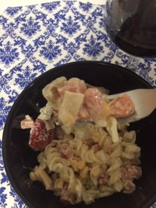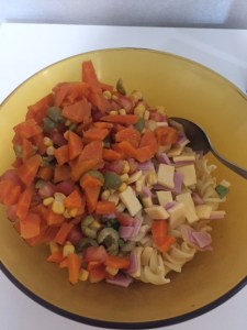A salada de macarrão é também conhecida como “Macarronese”, uma mistura deliciosa de macarrão com maionese.