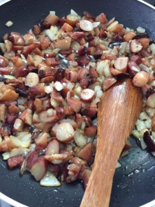 Junte a cebola picadinha e o alho, fritando bem na gordura que se soltou do bacon.