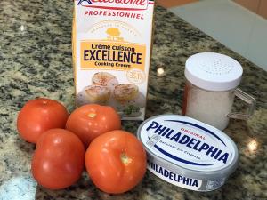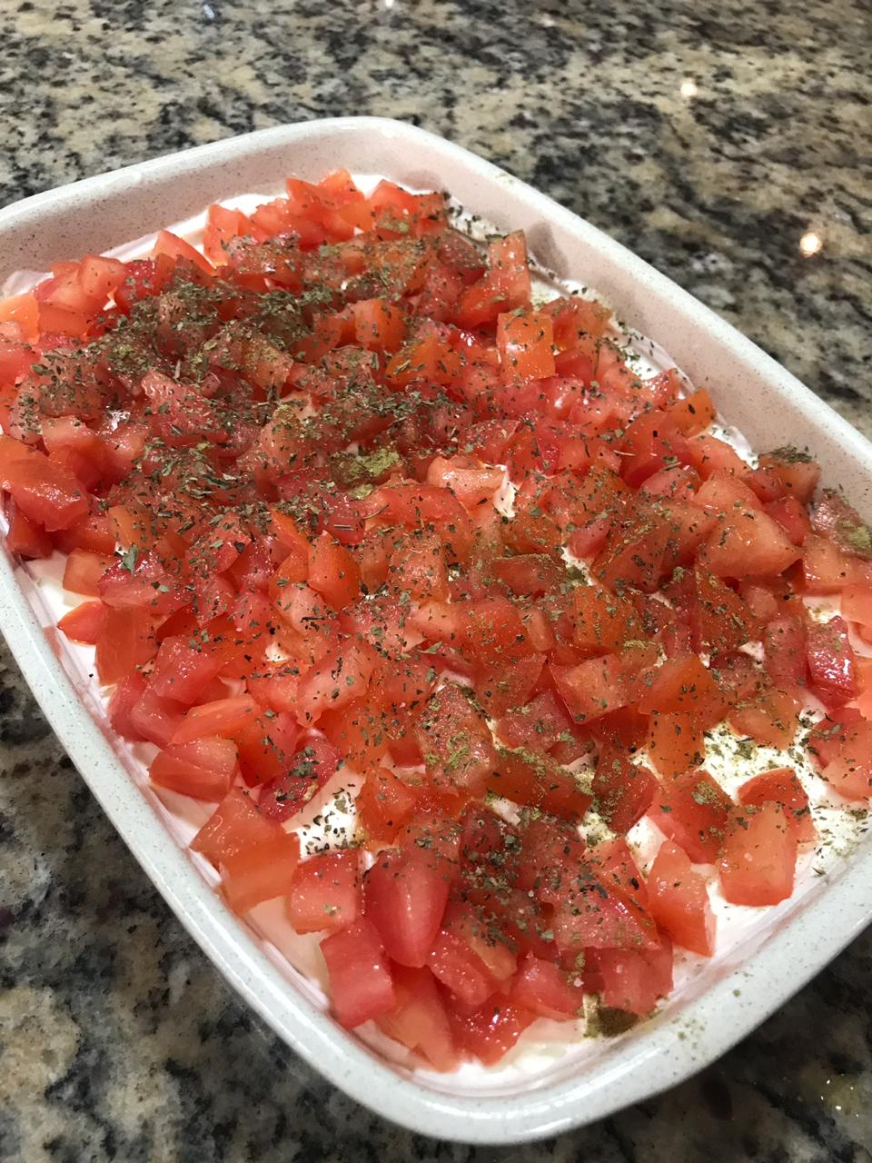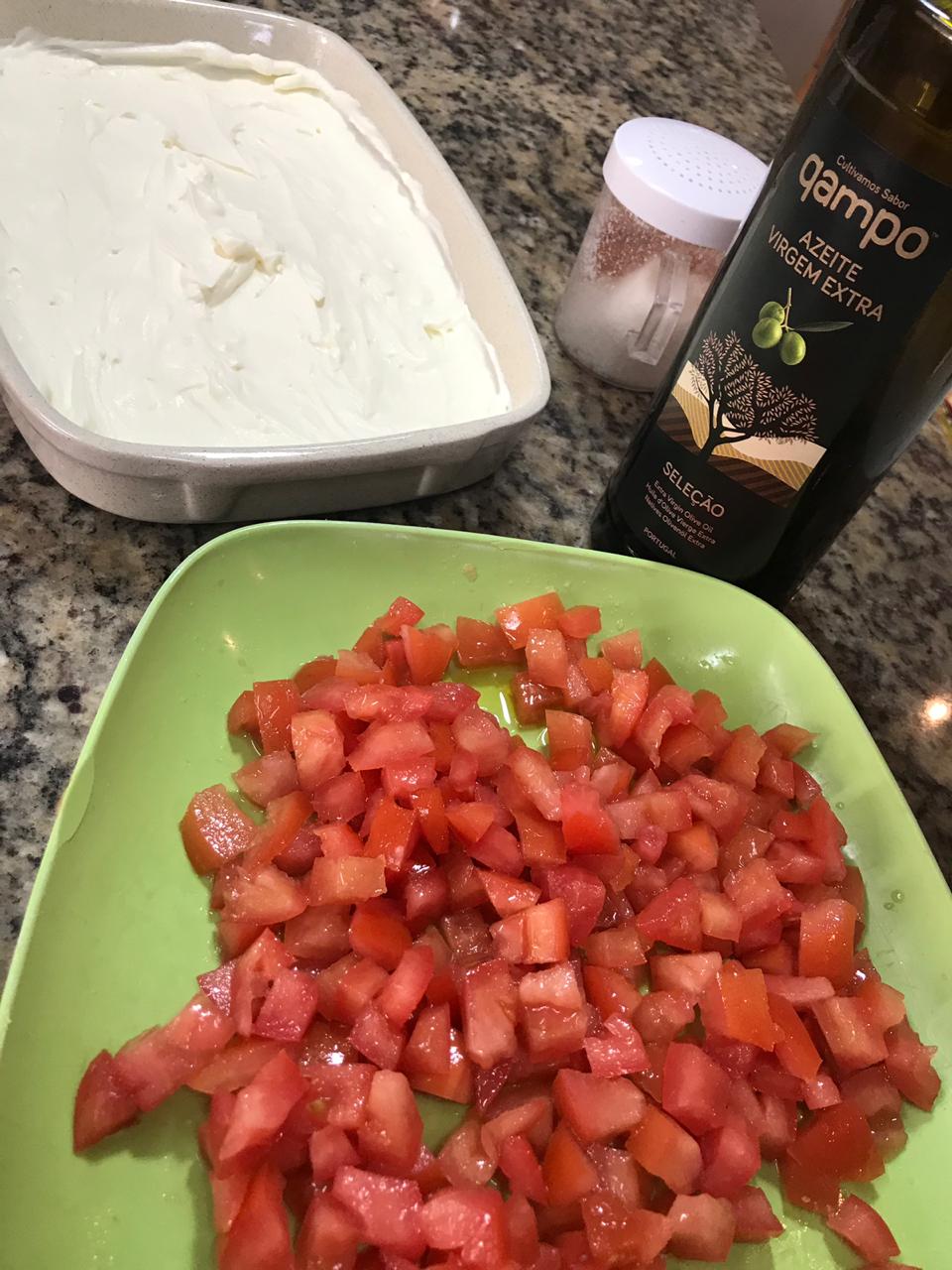 Coloque em um refratário esse creme e por cima, os tomates temperados.