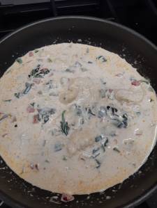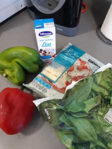Enquanto isso, frite num fio de azeite os pimentões e o espinafre com um pouco de sal. Junte o creme de leite e mexa bem. Depois o queijo (ralado no lado grosso) e mexa com fogo baixo.