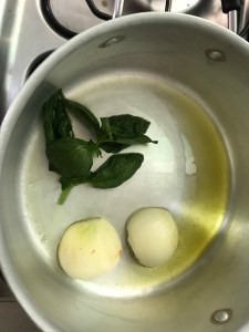 Numa panela coloque umas três colheres de azeite e coloque algumas folhas de manjericão e a cebola cortada ao meio.
