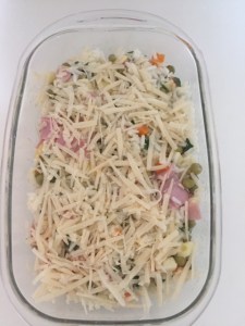 Junte o arroz cozido e depois coloque tudo em um pirex untado com azeite.