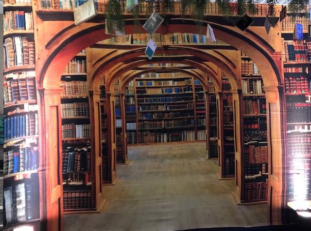 Já na entrada um enorme painel sugerindo uma galeria de livros.