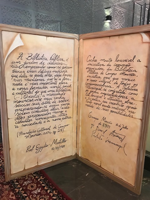 Esse trabalho acima feito em madeira, está nas dependências da Biblioteca e é uma homenagem ao fundador.