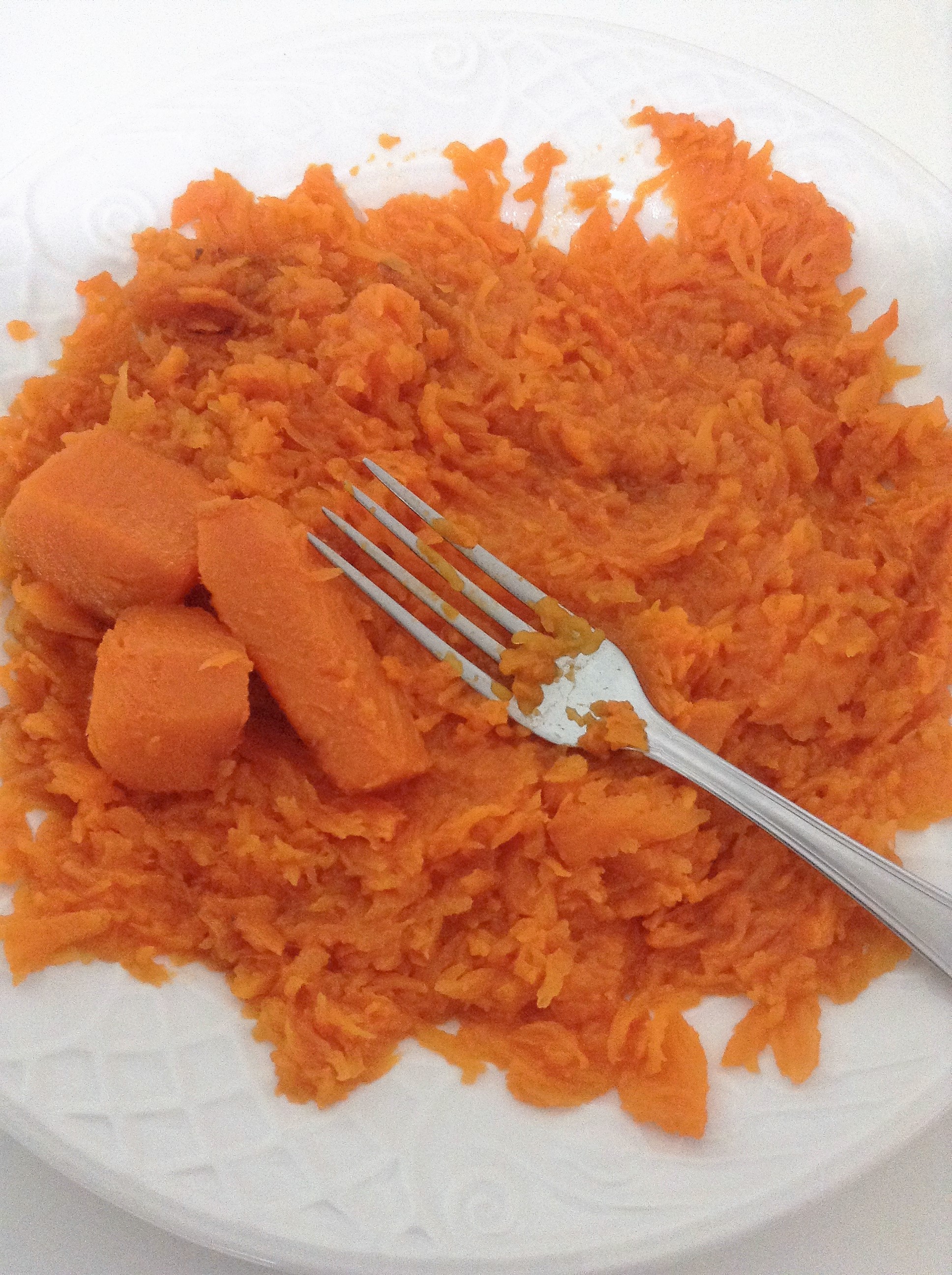 Depois disso, leve a abóbora cabotiá para cozinhar, amasse com um garfo e reserve também.