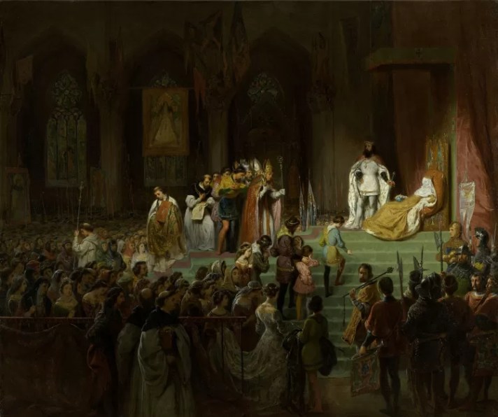 ( Em cerimônia no castelo, convidados tiveram que beijar a mão do cadáver de Inês, exumada para a cerimônia Imagem: Heritage Images via Getty Images)
