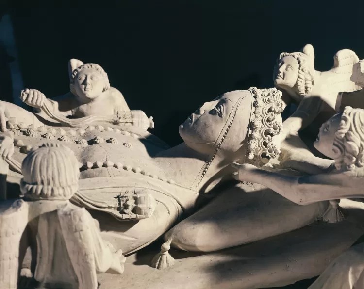 (Juntos na eternidade: o túmulo de Inês está na frente do sarcófago do rei, no Monastério de Alcobaça – De Agostini via Getty Images – )