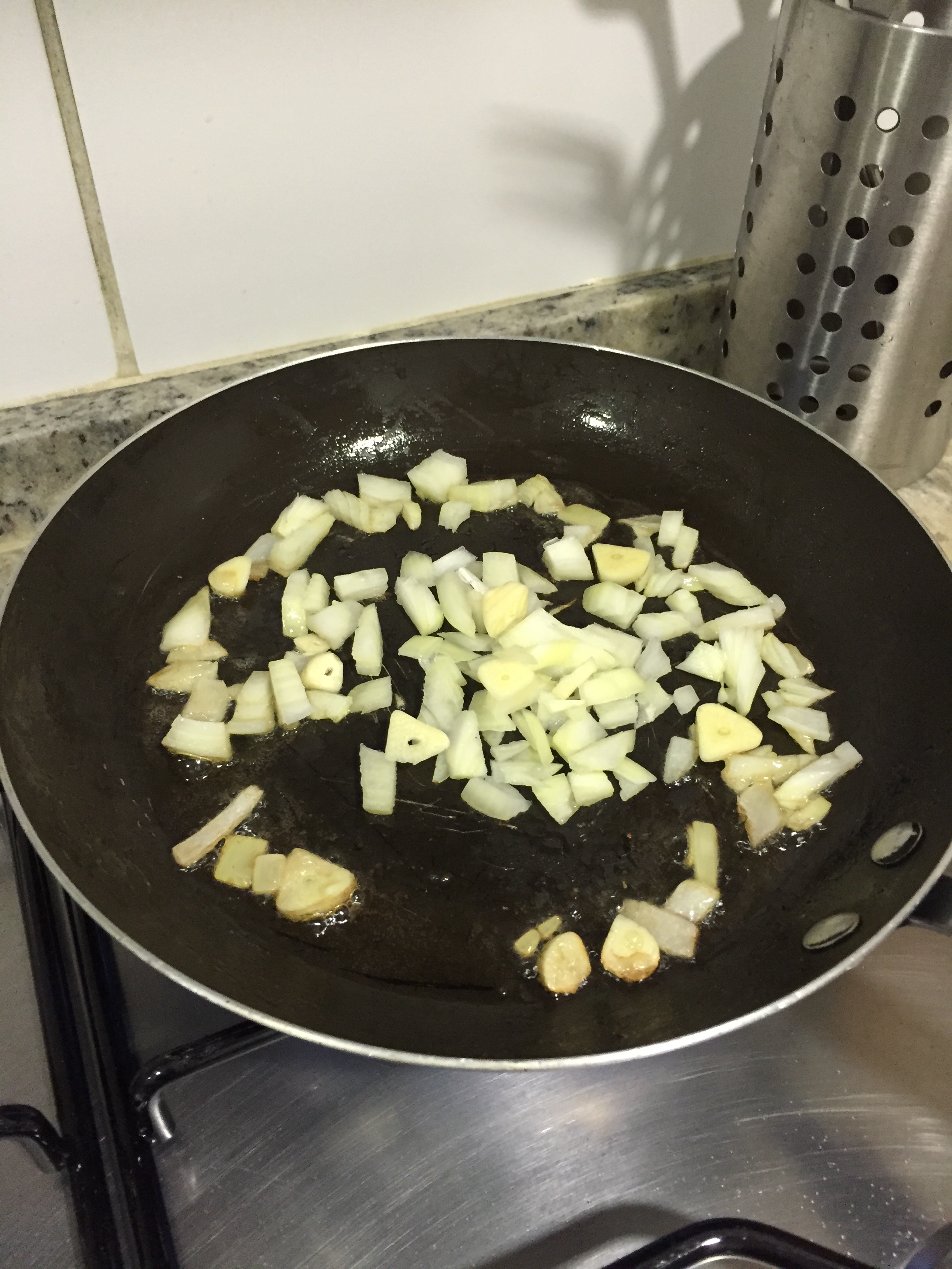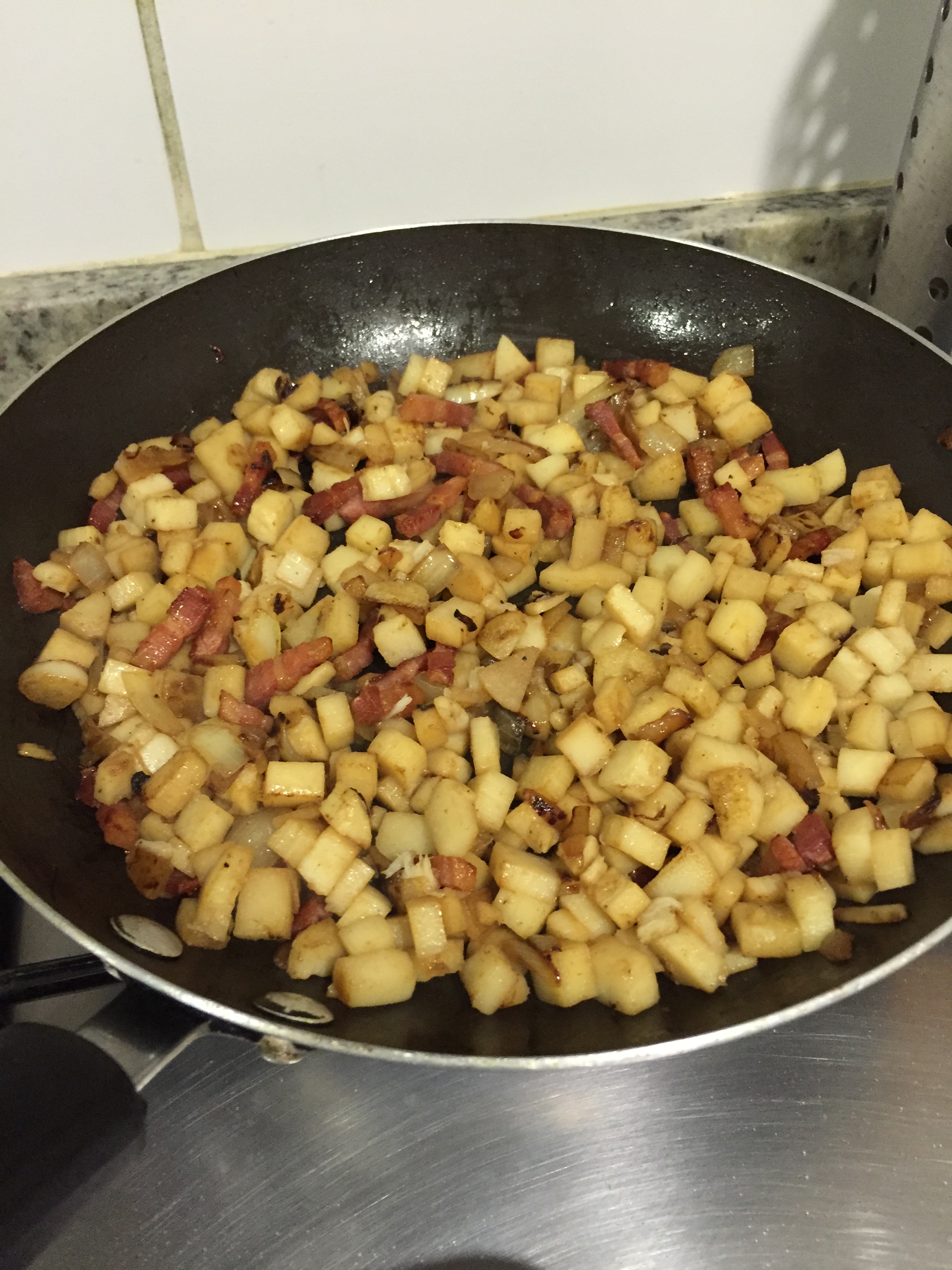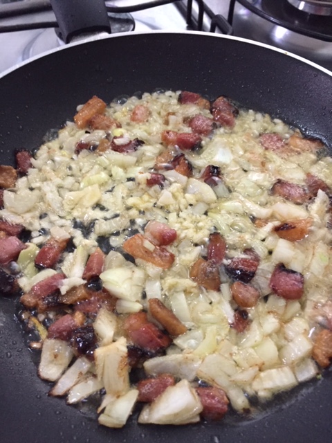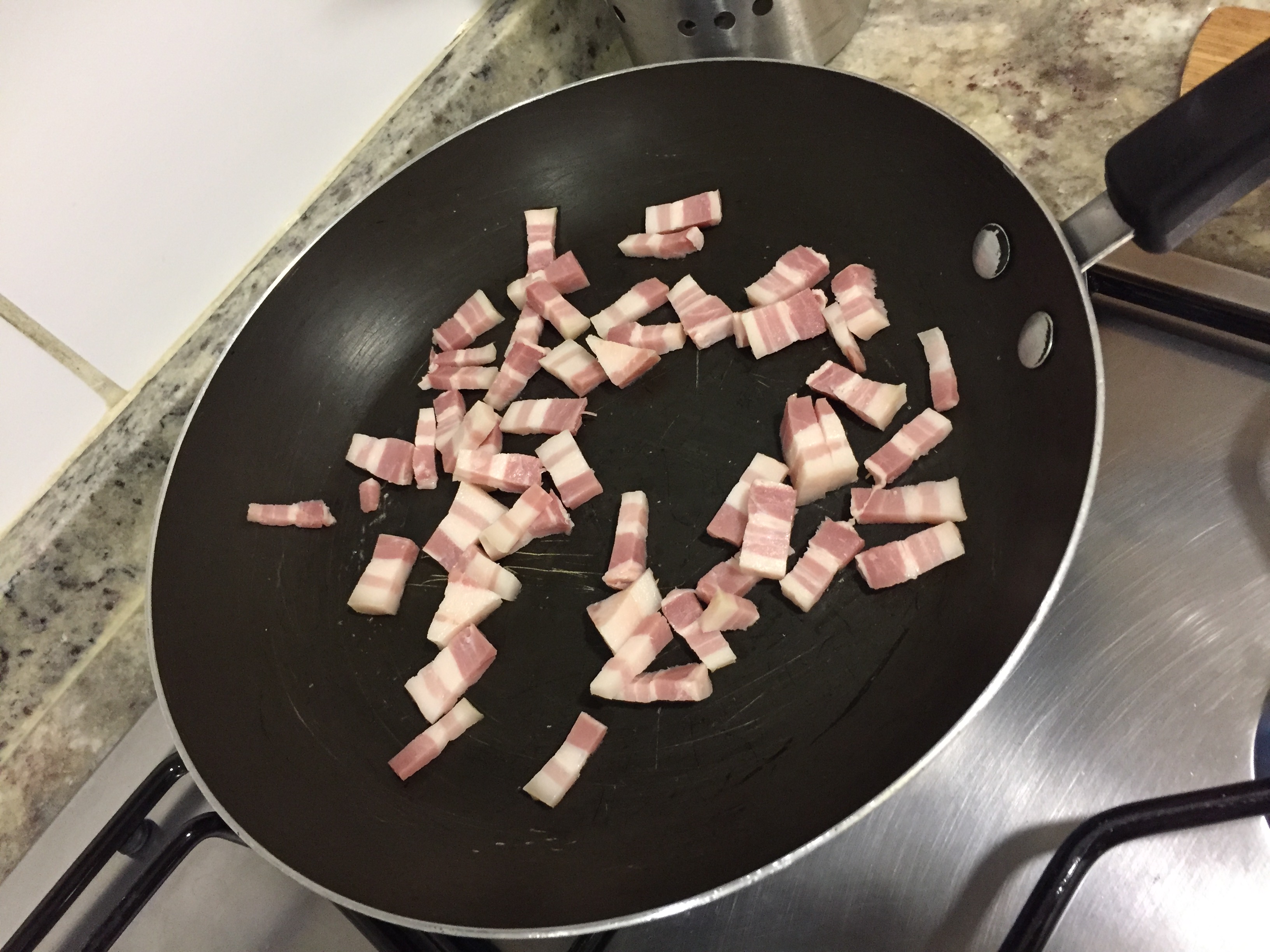 Enquanto as batatas cozinham, leve ao fogo em uma panela grande, o bacon para fritar com um pouquinho de azeite.