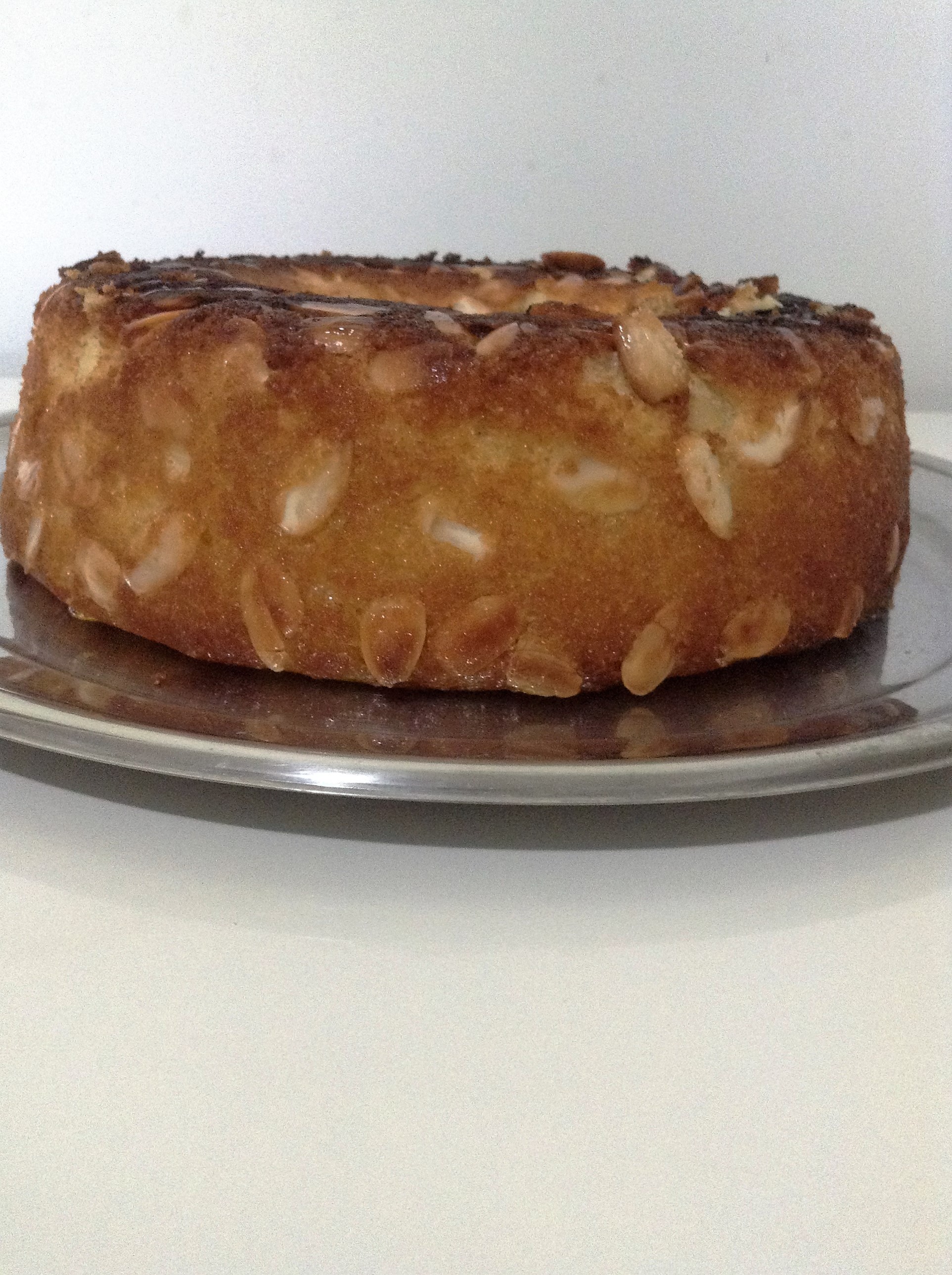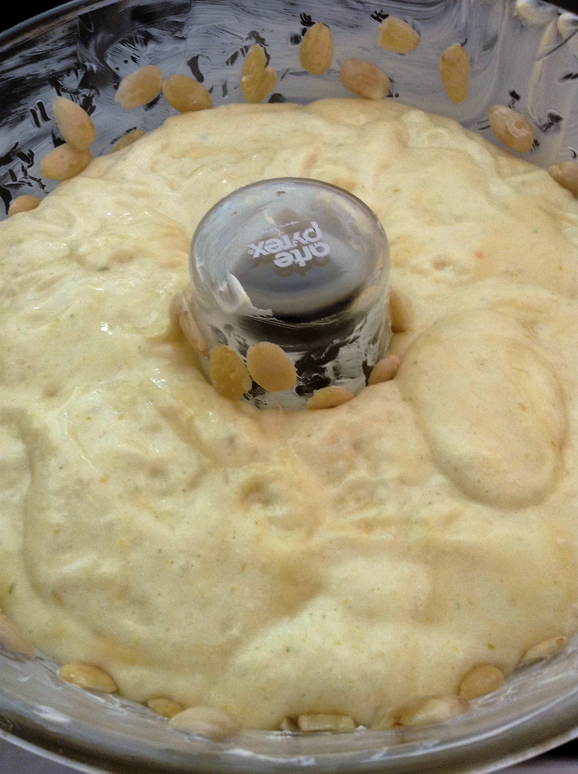 Unte com manteiga uma forma com buraco no meio e salpique as amêndoas nas laterais e fundo da forma para que grudem. Reserve.