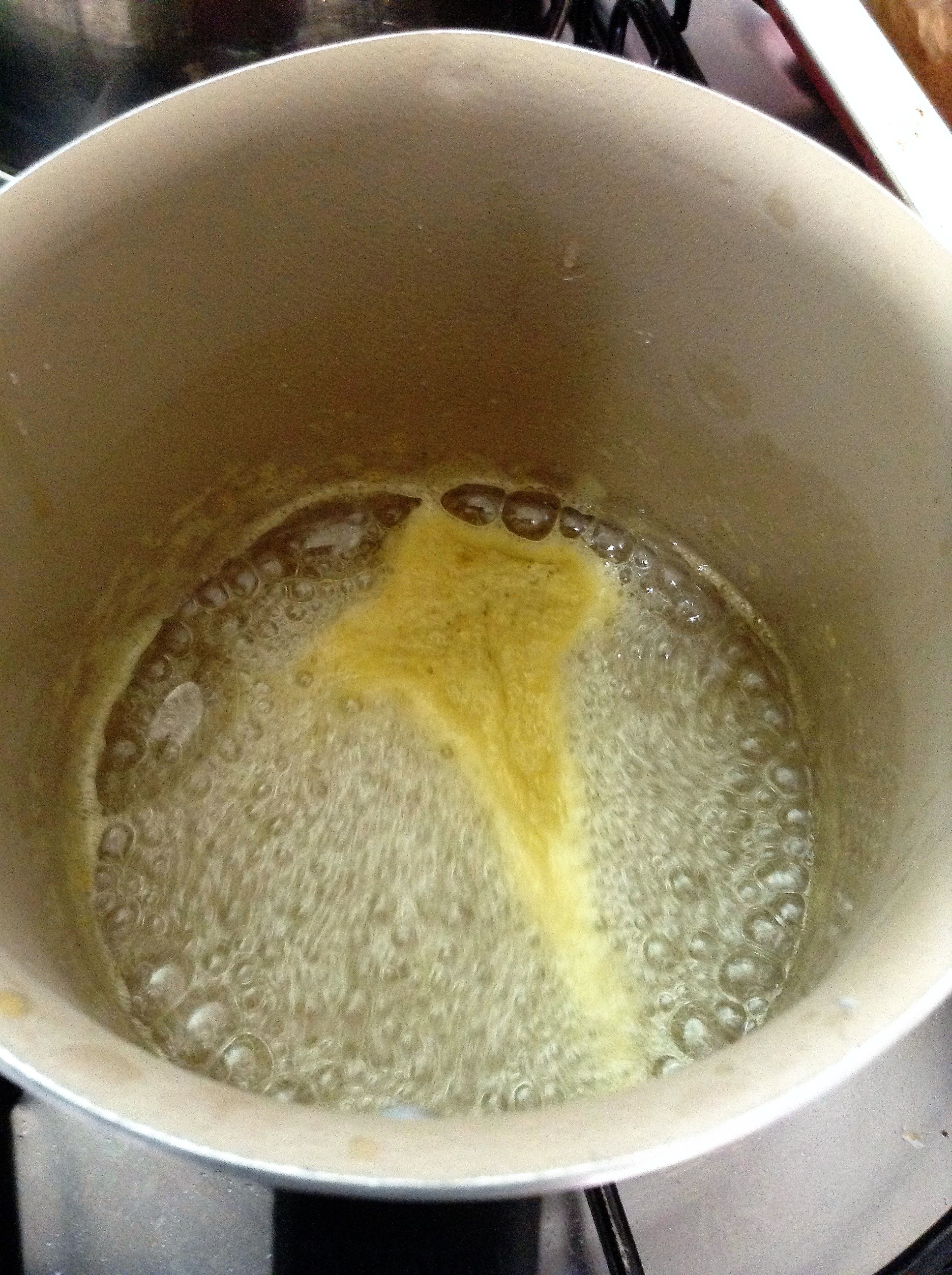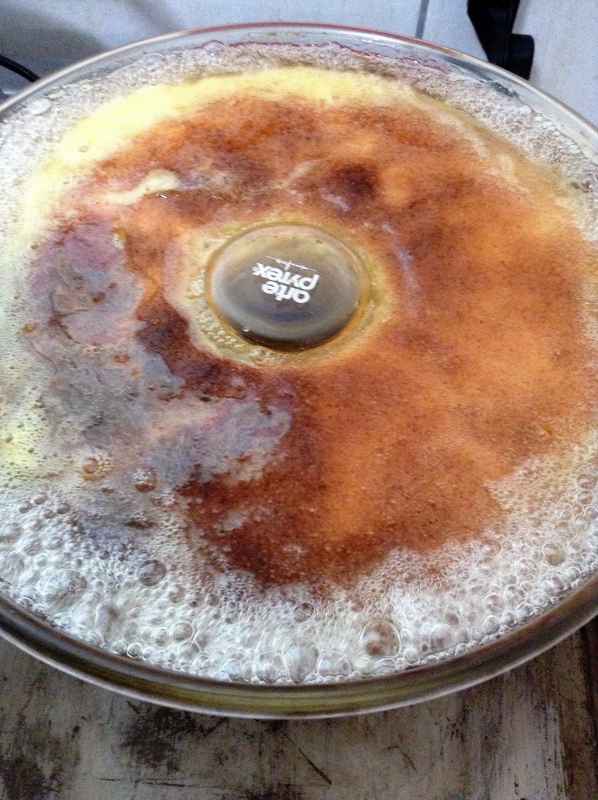 Retire o bolo do forno e em seguida despeje a calda quente por cima.