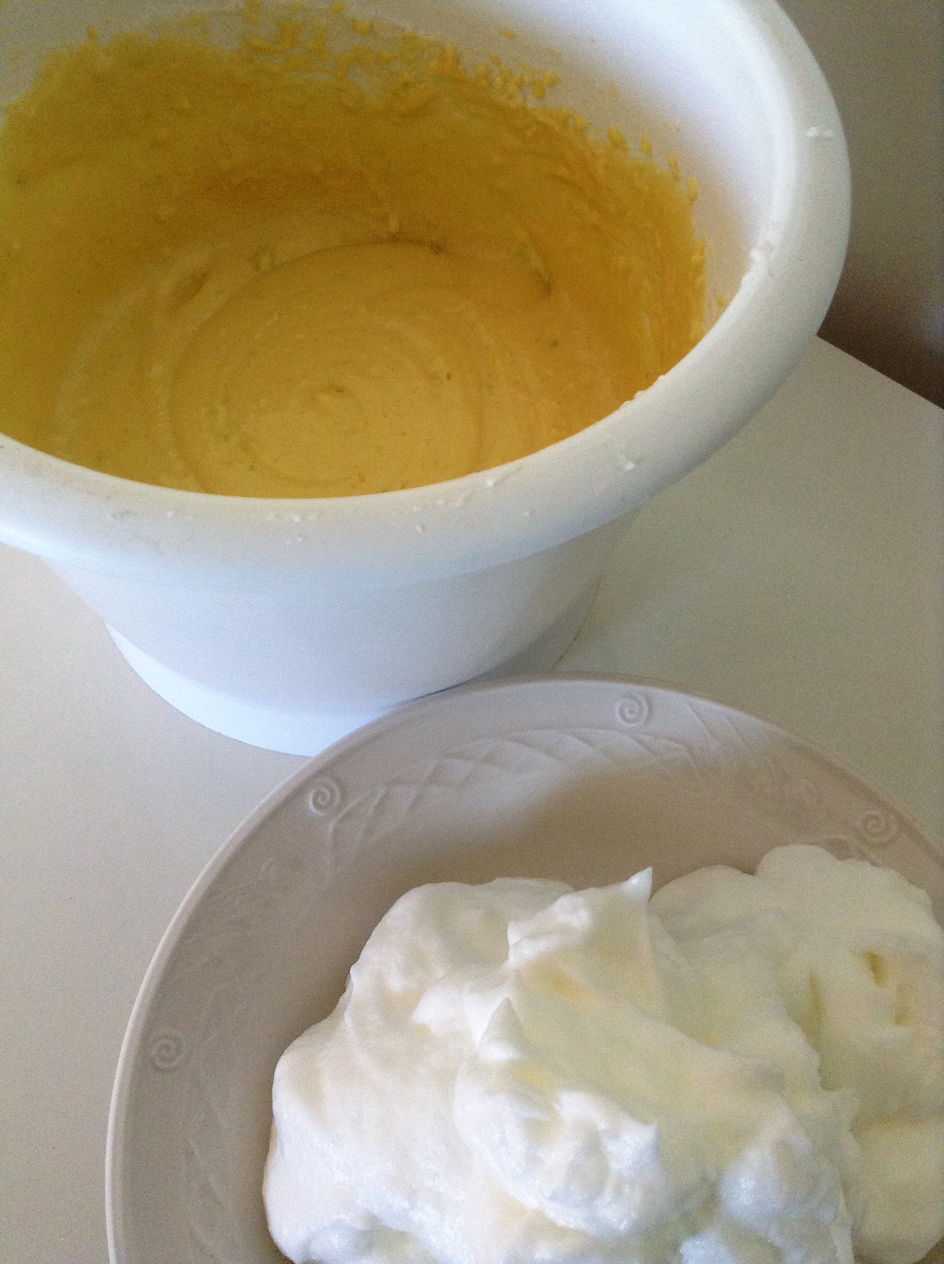 Junte super delicadamente as claras em neve à massa, mexendo de cima para baixo.