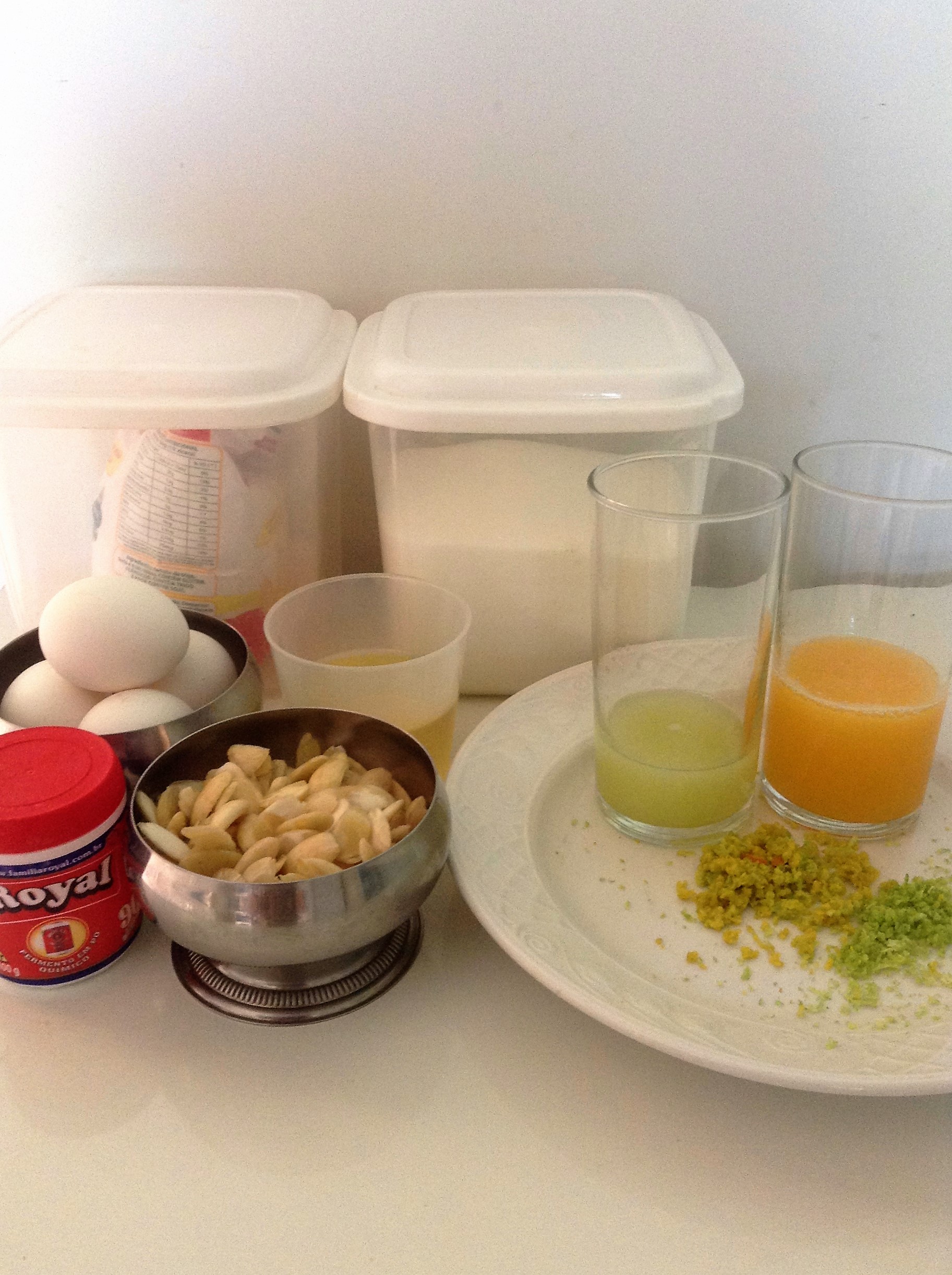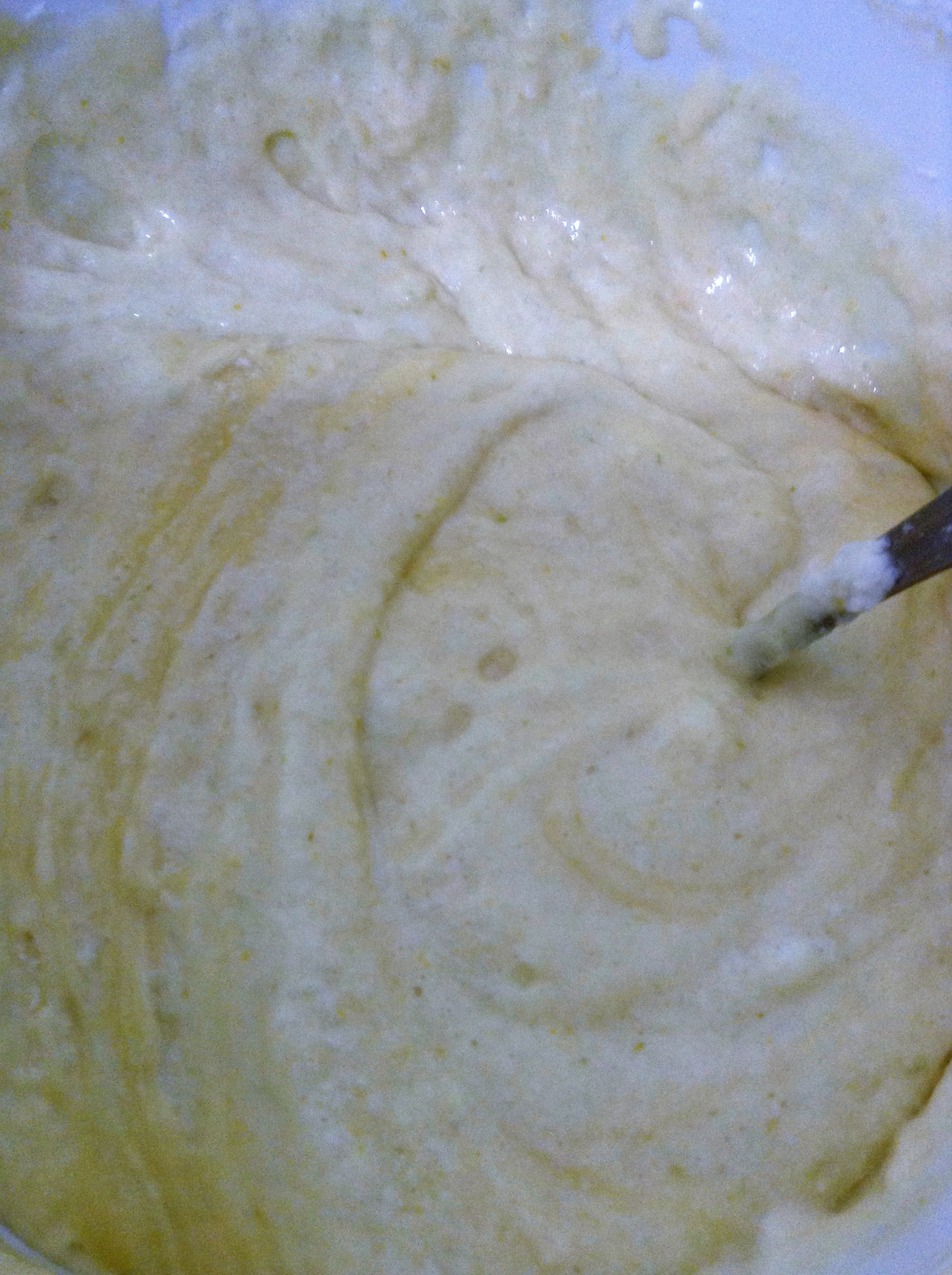 Coloque na batedeira as gemas, óleo, açúcar, farinha, sucos e raspas.