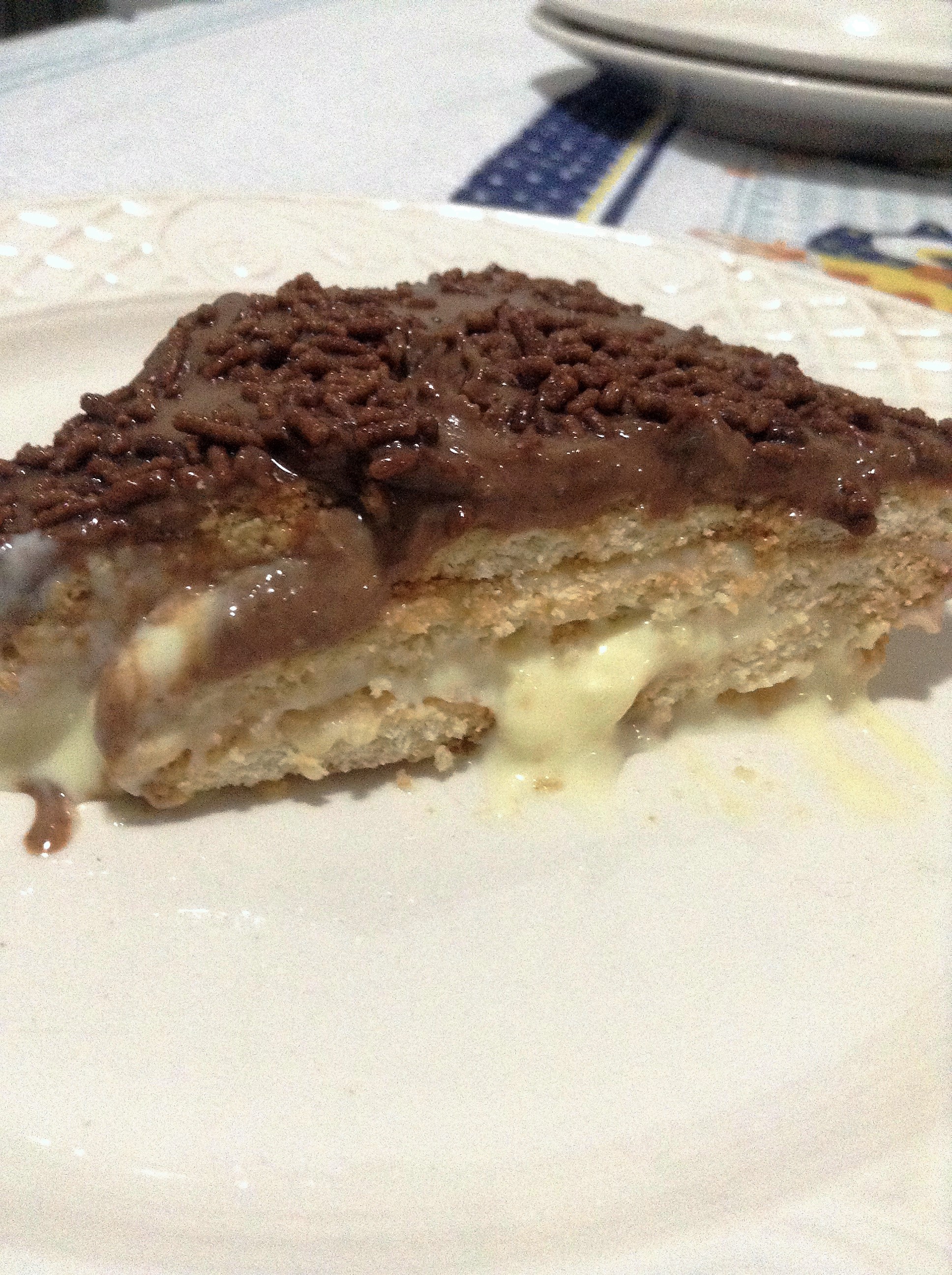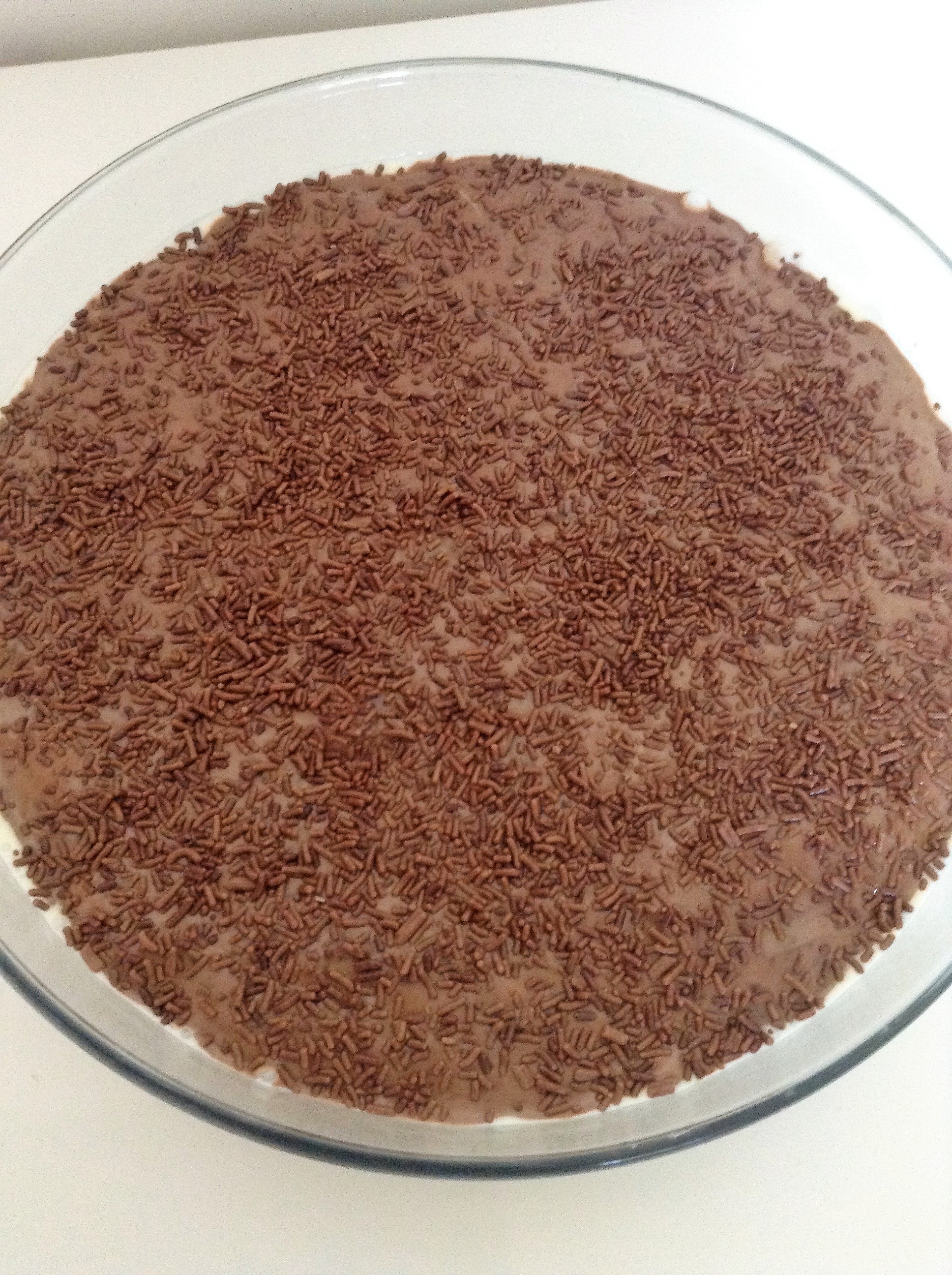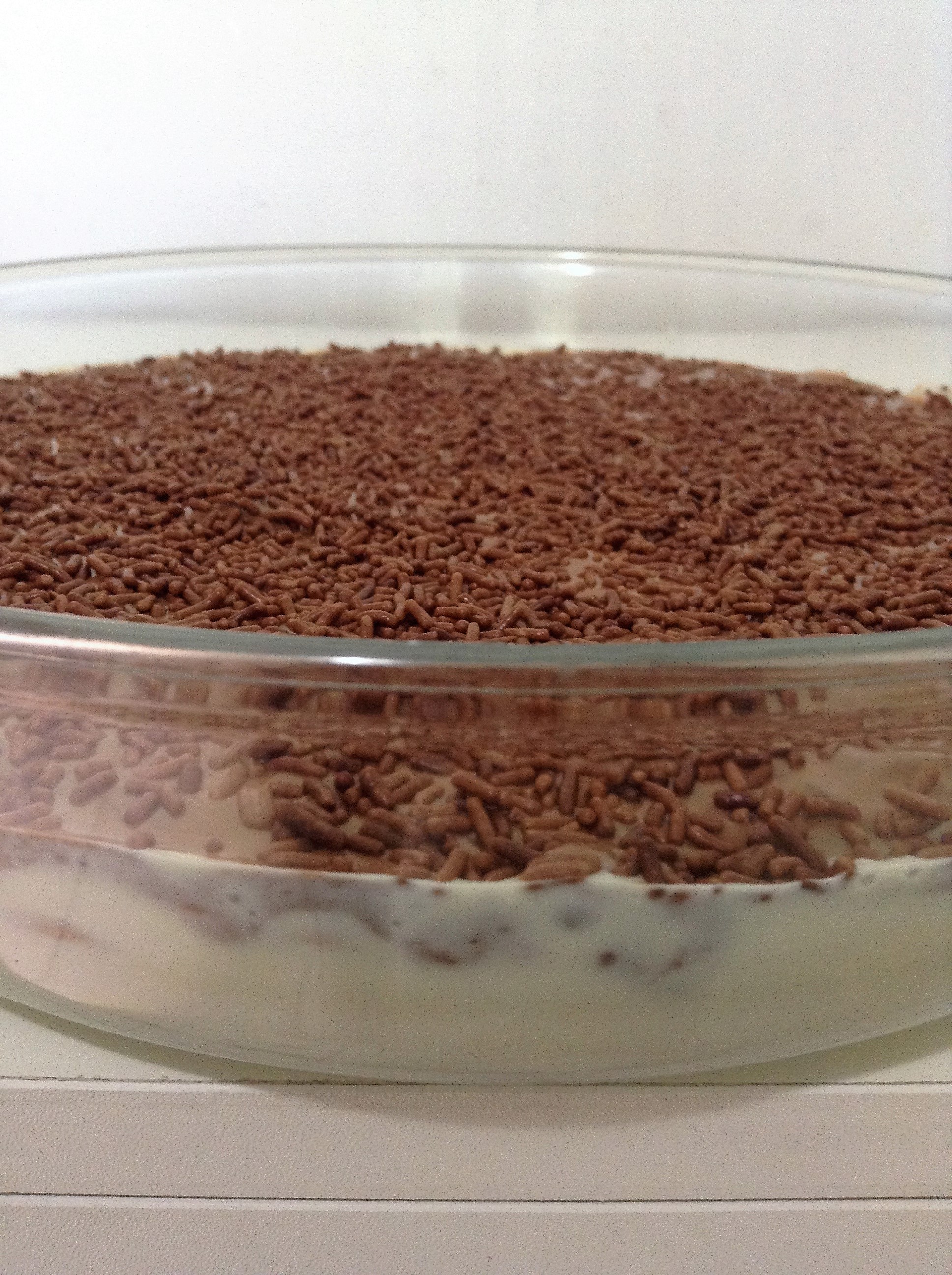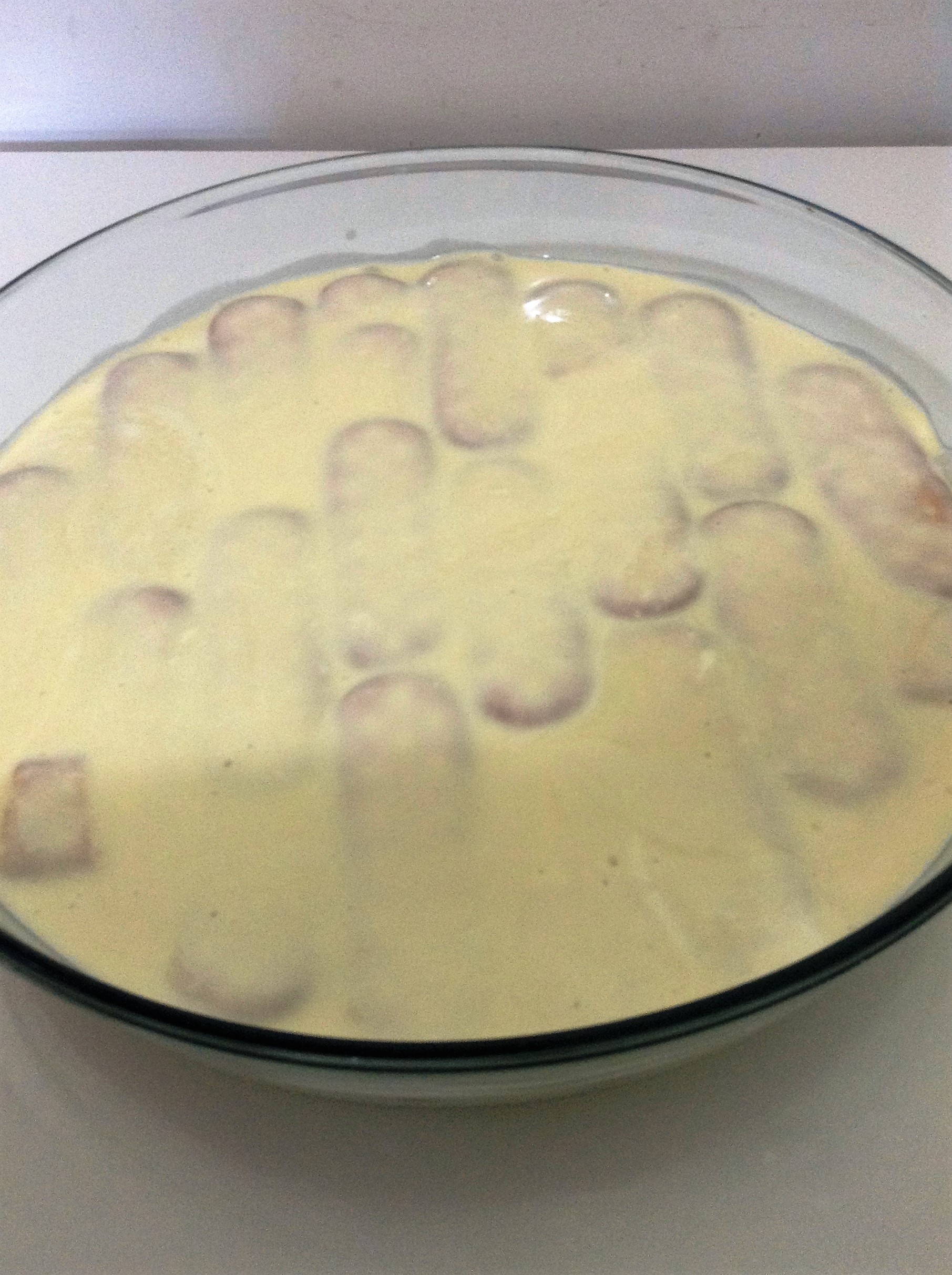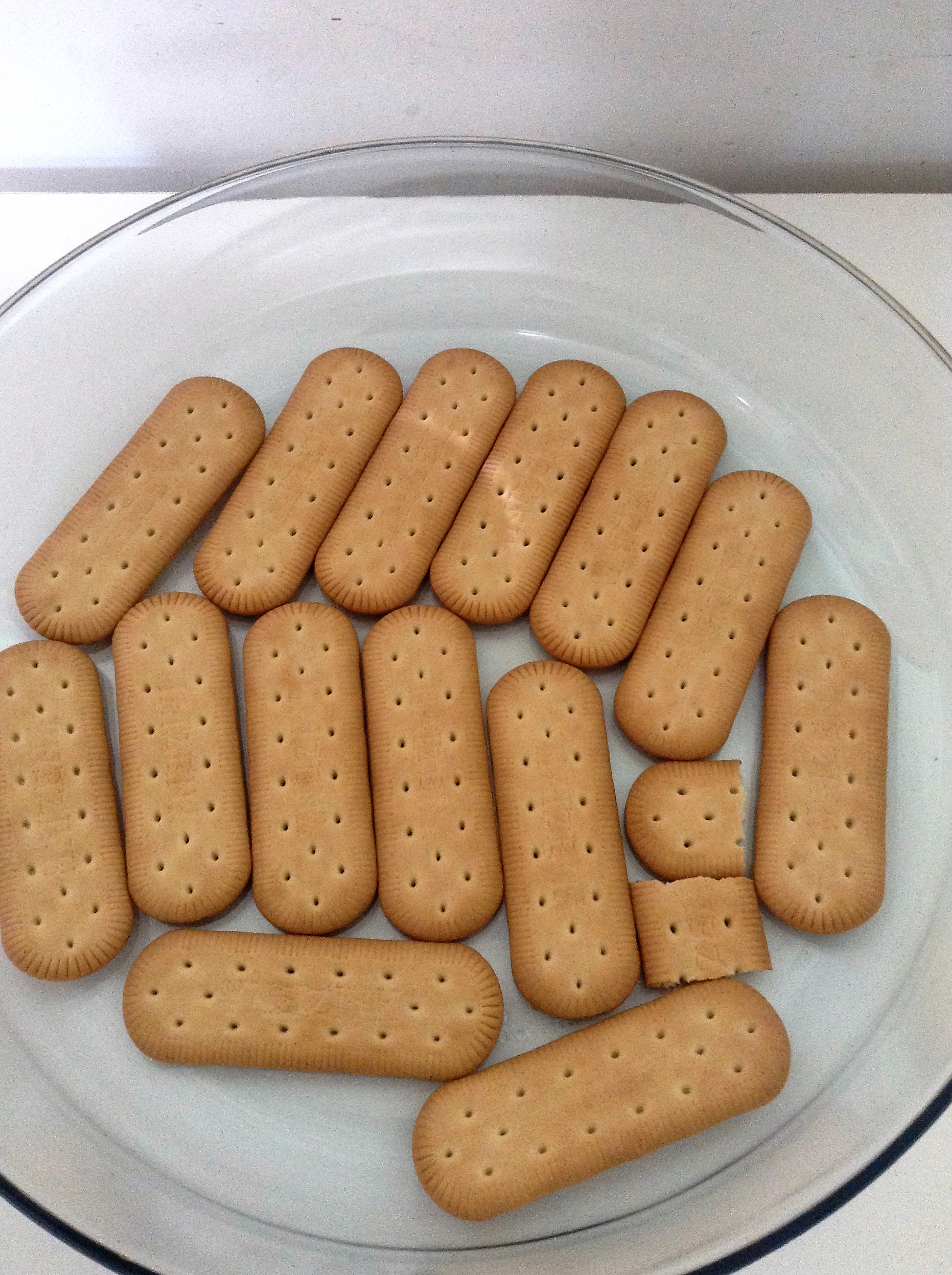 Passe rapidamente os biscoitos na calda do pêssego e vá acomodando em um pirex.