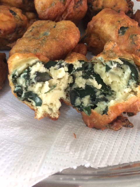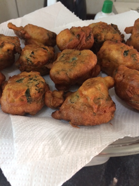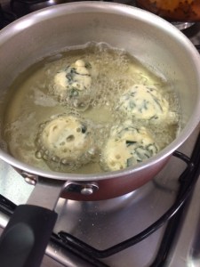 Aqueça o óleo em uma frigideira e com ajuda de uma colher, vá colocando a massa (eu coloquei duas colheres de sopa de massa em cada bolinho).