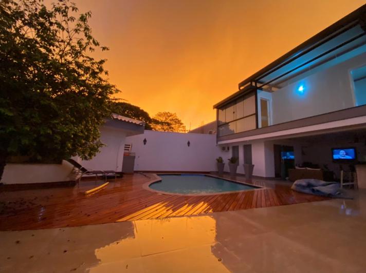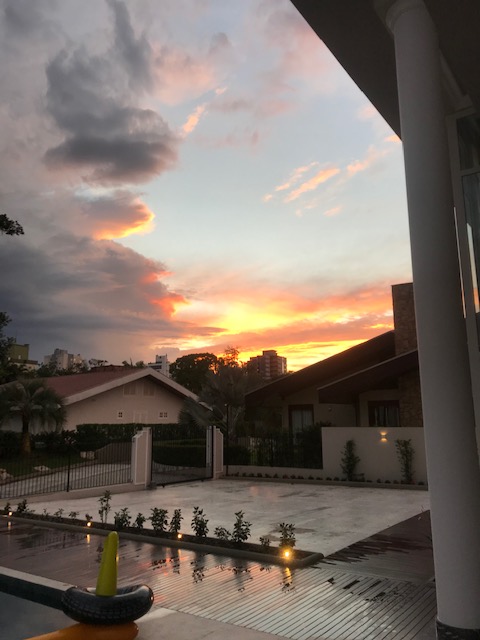 Meu filho conseguiu uma linda foto com direito à piscina e parte da casa banhadas pelo por do sol.