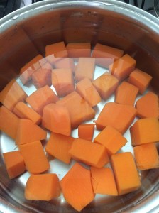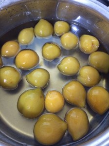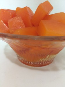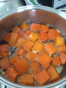 Primeiro comece descascando a frua; corte ao meio e com ajuda de uma colher, retire as sementes até deixar apenas os copinhos.