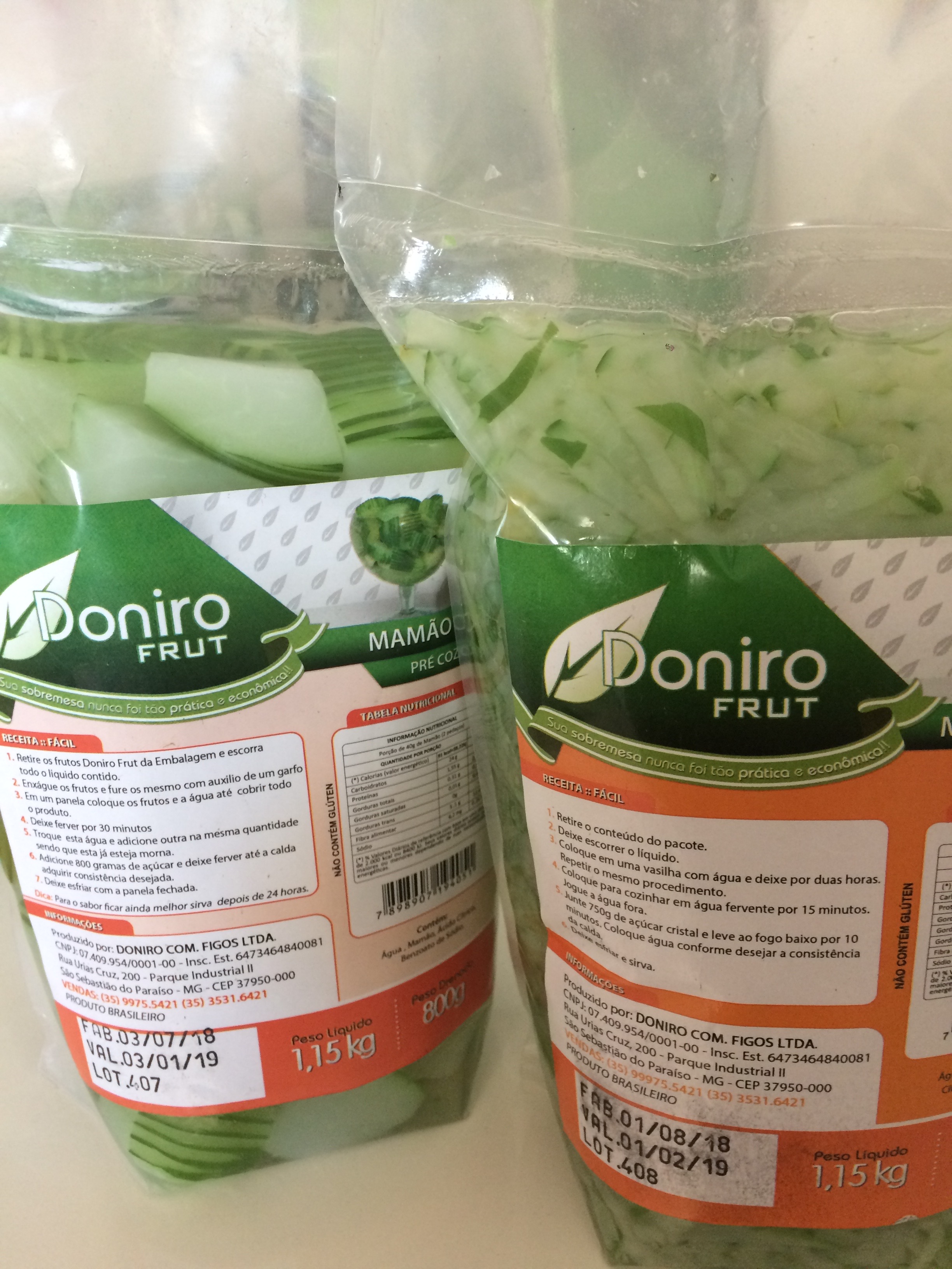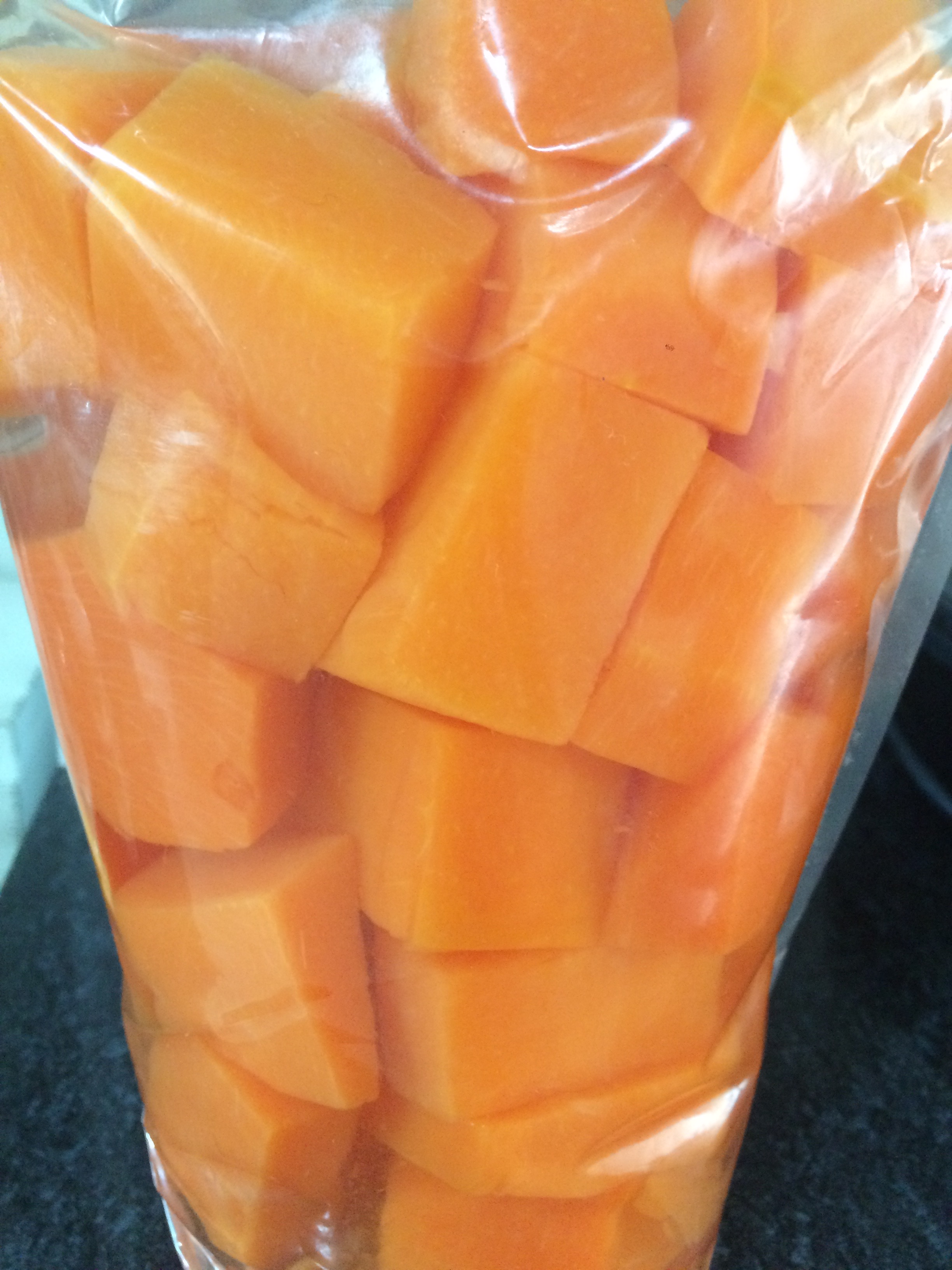 Primeiro comece descascando a frua; corte ao meio e com ajuda de uma colher, retire as sementes até deixar apenas os copinhos.