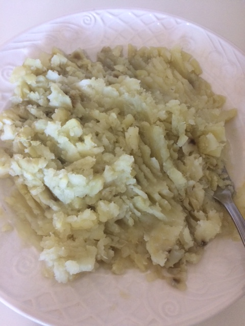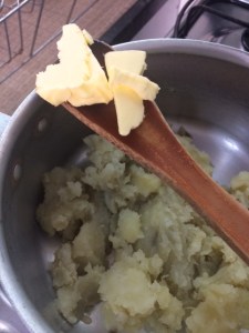 Na mesma panela onde cozinhou, coloque as batatas amassadas e a manteiga, depois o leite e mexa bem.