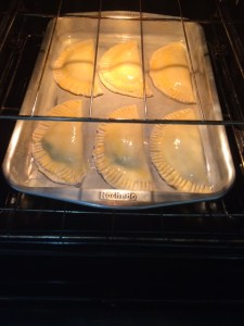 Unte uma assadeira e vá colocando os “pastéis”; pincele cada um com a mistura de gema e creme de leite e leve ao forno que deve estar bem quente 220º por quinze minutos (um dos segredos é esse: forno super aquecido)!
