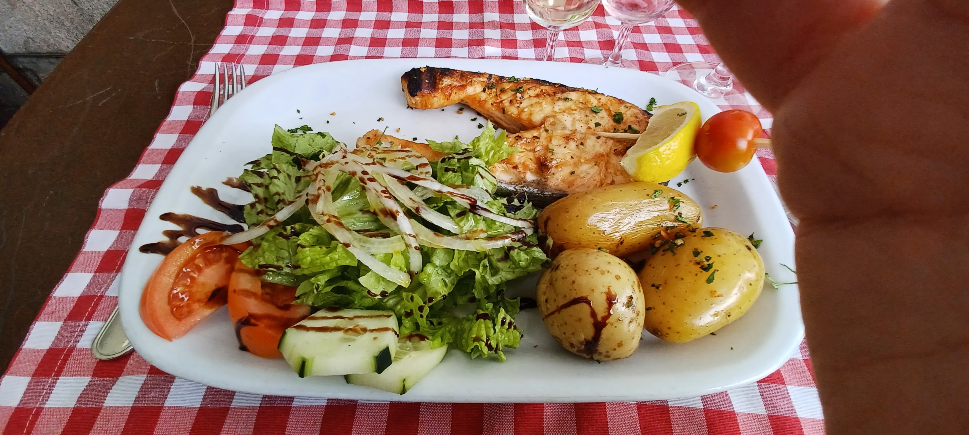 Uma comida deliciosa foi na Ribeira do Porto, restaurante Chez Lapin: um salmão com batatas ao murro e vinho branco.