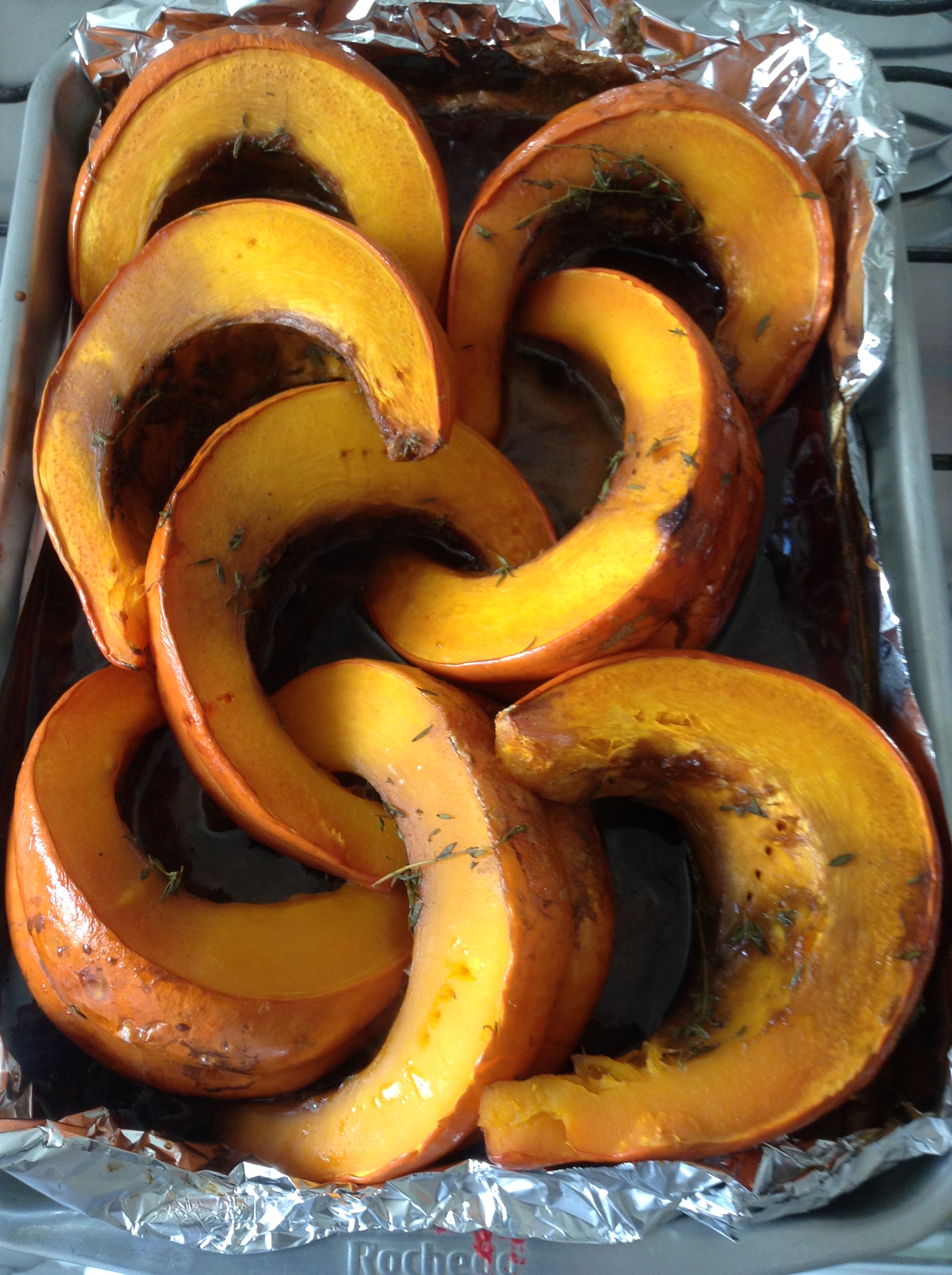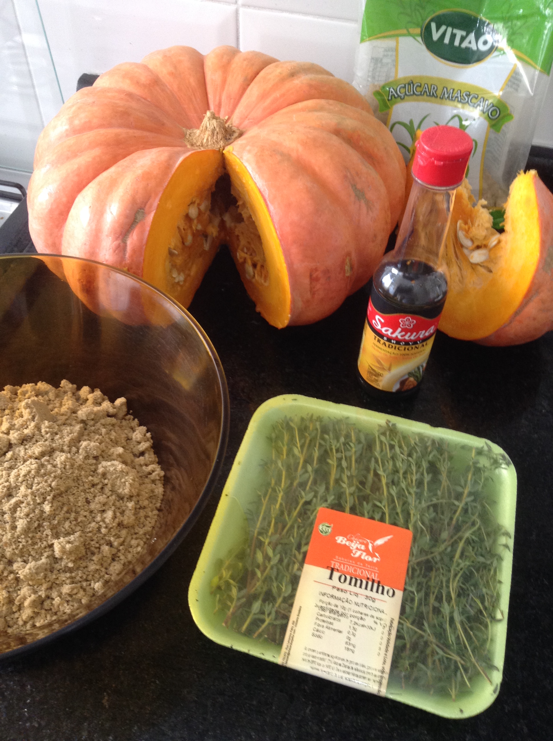 Enquanto o pernil assa, prepare a abóbora: corte-a em fatias (meia lua). Misture o açúcar mascavo com o shoyu para formar uma pasta e junte uma parte do tomilho.