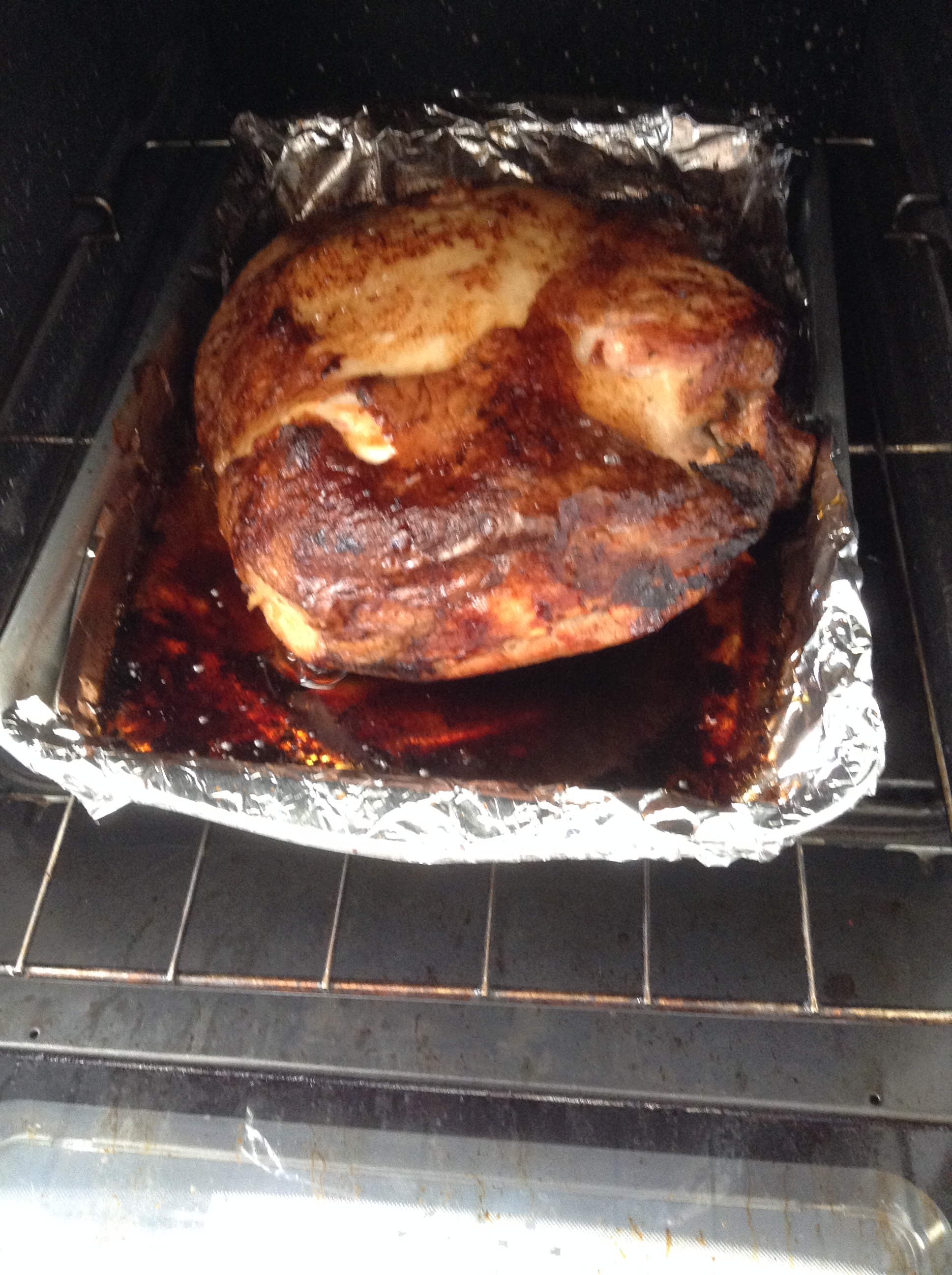 Coloque-o, ainda no plástico interno, em uma assadeira e leve para assar em forno pré aquecido (200°) por 3 horas.