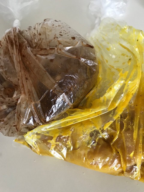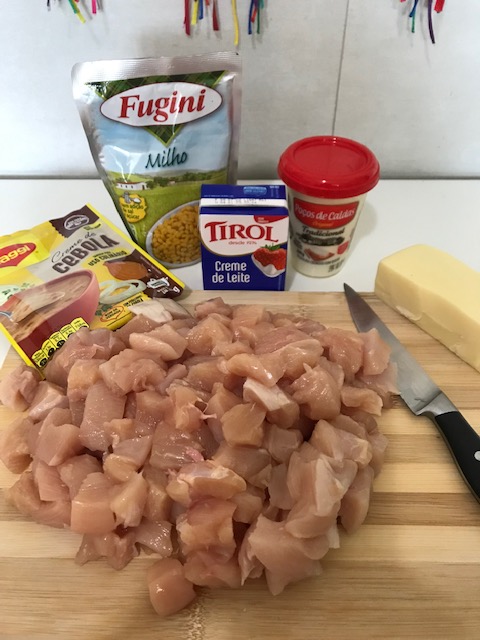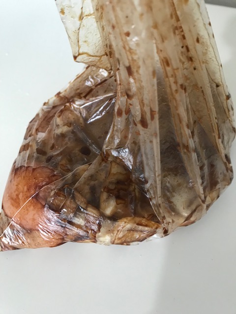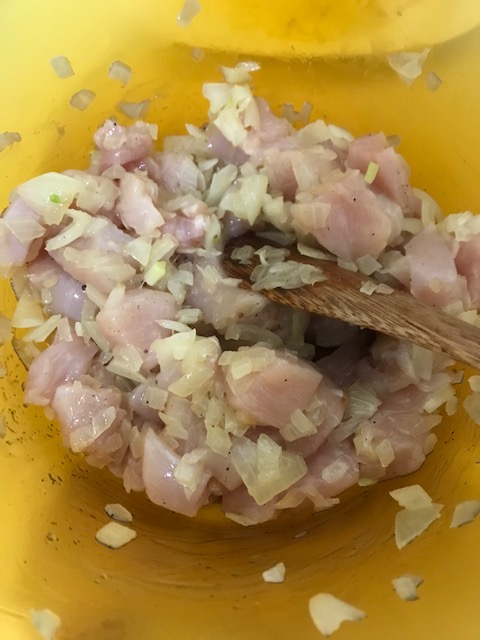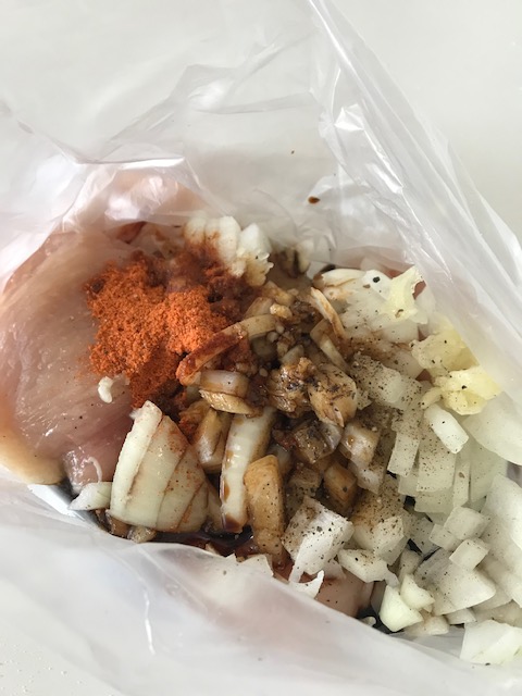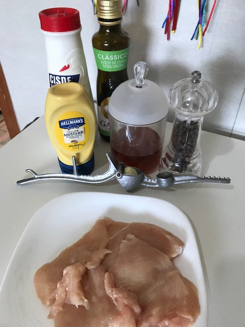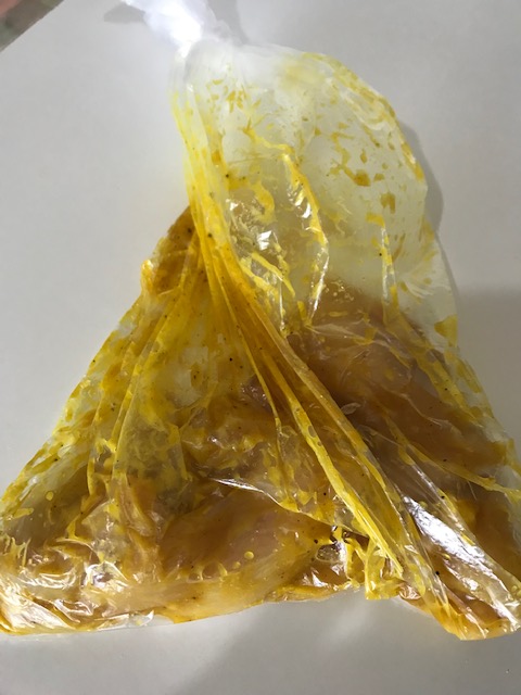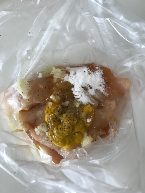 Faça da mesma maneira: coloque em um saco plástico o peito de frango e todos os demais ingredientes, feche e mexa misturando bem.