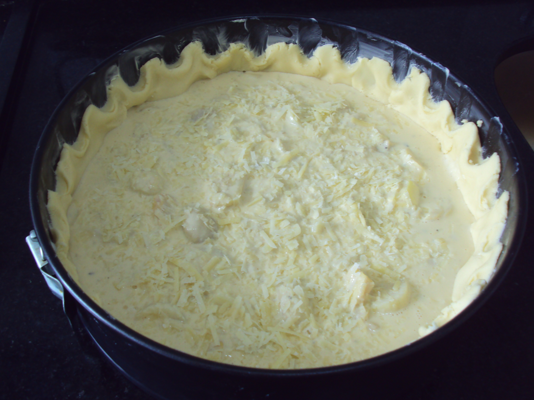 Bata todos os ingredientes da massa em liquidificador e coloque metade em uma forma untada.