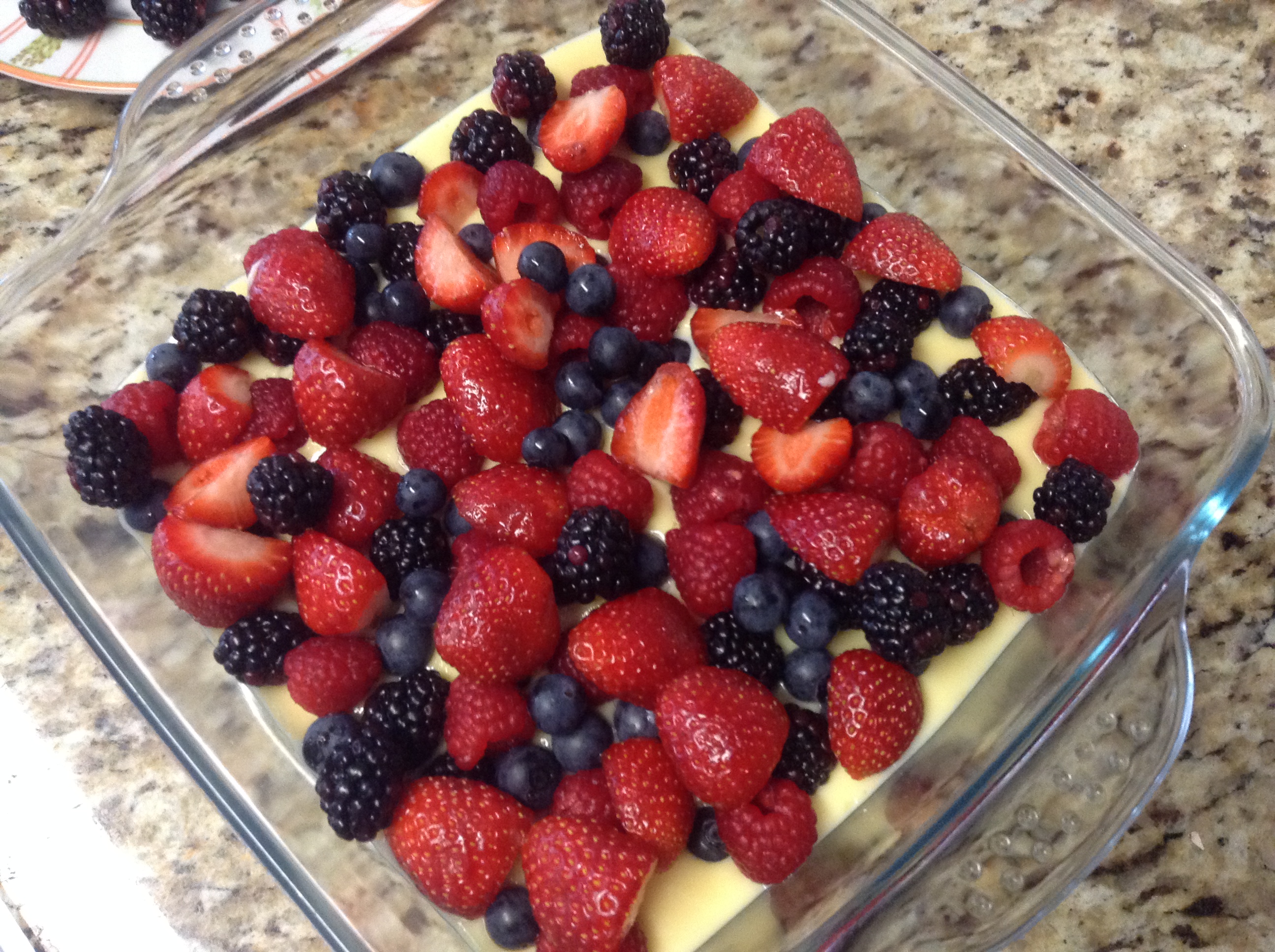 Distribua metade do creme e metade dos pêssegos picados repetindo a mesma camada mais uma vez.
